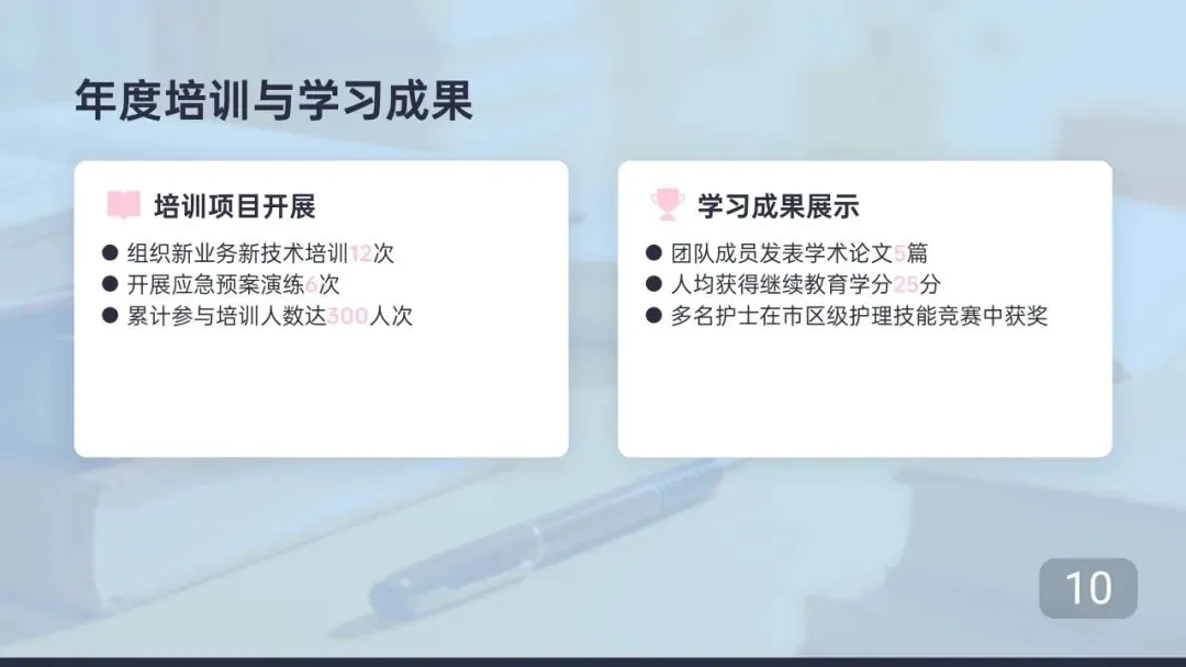 全年开展新业务培训12次、应急演练6次,累计培训300人次;团队发表学术论文5篇,人均获继续教育学分25分,多名护士在市区级技能竞赛获奖,培训完成率100%。