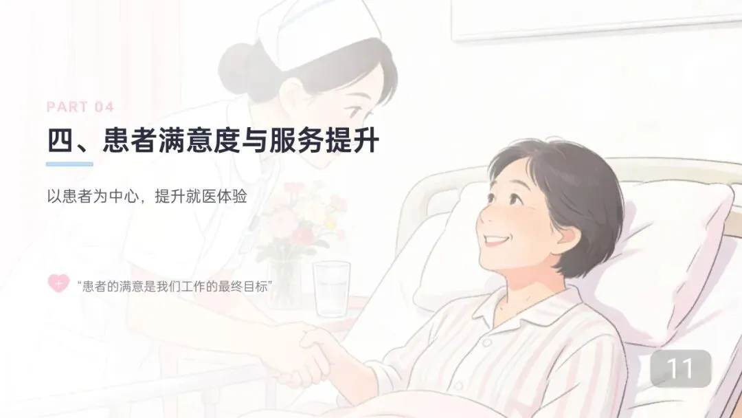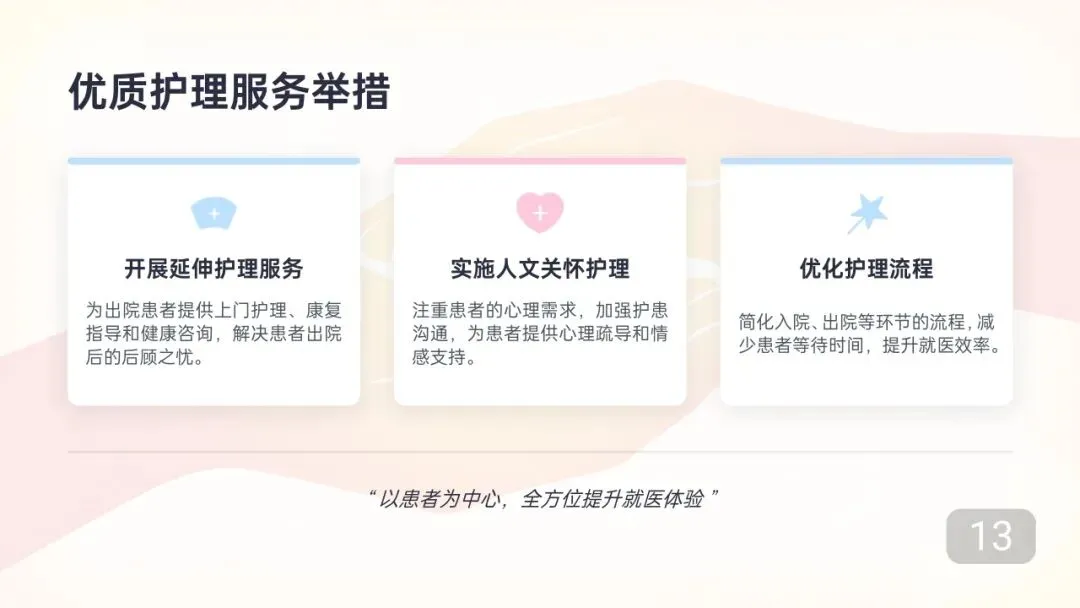 推出三大优质服务举措:开展出院患者上门护理等延伸护理服务;实施心理疏导、情感支持的人文关怀护理;简化入院出院流程,优化护理流程提升就医效率。
