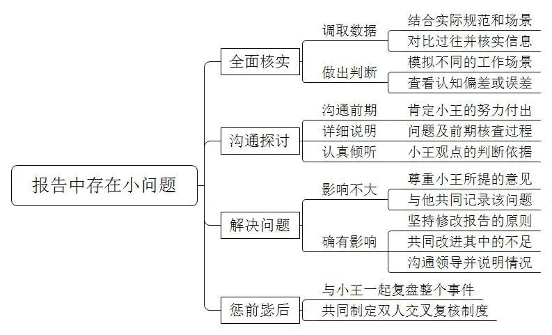 结合实际规范、实际场景进;结合不同岗位,对数据情况进行研判,判定其是否严重影响不大:尊重小王意见,共同记录问题,为后续优化做参考。影响很大:坚持修改报告的原则,和小王共同改进报告中的不足;跟领导进行沟通,说明情况。复盘-找根本原因,与小王一起复盘整个流程,共同指定双人交叉复核制度。面对题干中的情况,我会以严肃认真的态度进行妥善的处理,具体处理步骤如下:全面核实问题。我会再一次对这份报告进行梳理,重点查看这份报告所涉及的主要内容,分析方向,尤其是对于这个小问题,所处的具体位置与小问题所相关的一些其他数据资料等进行重点核实。此外,我会根据小问题所涉及的业务对接主管科室,邀请其他同事进行阅读,模拟不同岗位人员查阅报告的场景,判断问题是否可能引发歧义,客观评估这个问题对整体的影响程度,为后续处理提供依据。主动沟通小王。一方面,我会在肯定小王对工作付出的基础之上,介绍我对这份报告进行的梳理,以及我与科室的其他同事模拟判断的结果等,说明我对这个问题影响的初步评估。另一方面,我会再认真倾听小王认为“问题不大”的理由,了解小王判断的依据,听一听他对我这些判断的评价,并对这个问题进行再次讨论和研判。及时解决问题。我会根据调查了解的结果针对性进行处理:如果经过前期沟通核实,发现这个问题确如小王所说仅仅是一些细节方面的瑕疵,并没有对我们整体工作和核心内容产生实质性的影响,那么我会尊重小王的意见,与他共同记录该问题,作为后续报告优化的参考;但如果调查之后发现此问题虽小,但确实可能导致我们对工作成效的误判,或者影响部门对信息把握的准确程度,那么我会坚持修改原则,与小王一起梳理修改方案,明确修改内容和依据,并主动向领导说明情况,诚恳承认疏漏,汇报修改思路,征得领导同意后及时完善报告并重新提交。深刻反思总结,完善工作机制。问题解决后,我会与小王共同复盘整个事件,针对此次暴露的问题,我们将共同制定双人交叉复核制度,明确报告提交前需双方进行双重校验,并建立问题台账,切实提升团队工作质量,避免类似情况再次发生。