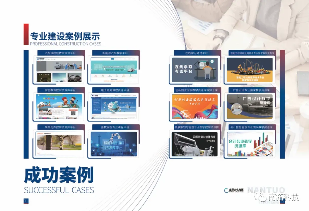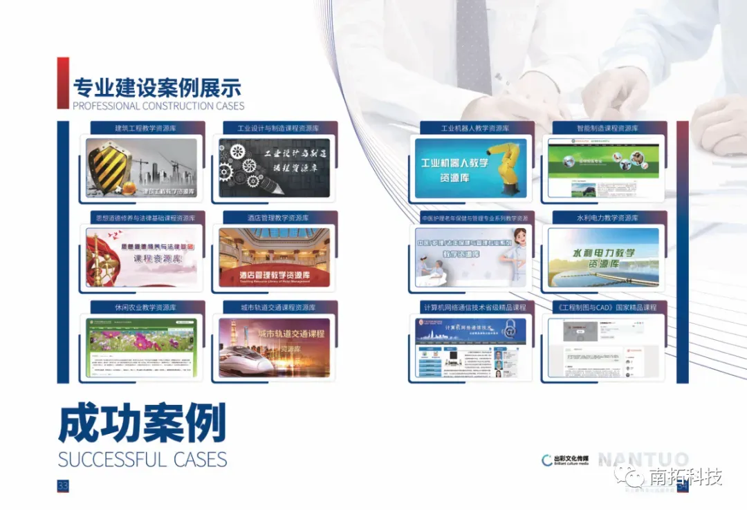 南拓优势:我们牵头联动33所优质职业院校、17家行业龙头企业,共建专业教学资源库,推动校企场景共融,将企业真实生产项目、智能化产线引入校园,实现“课堂即工地、学习即实践”,助力院校打造产教融合标杆。