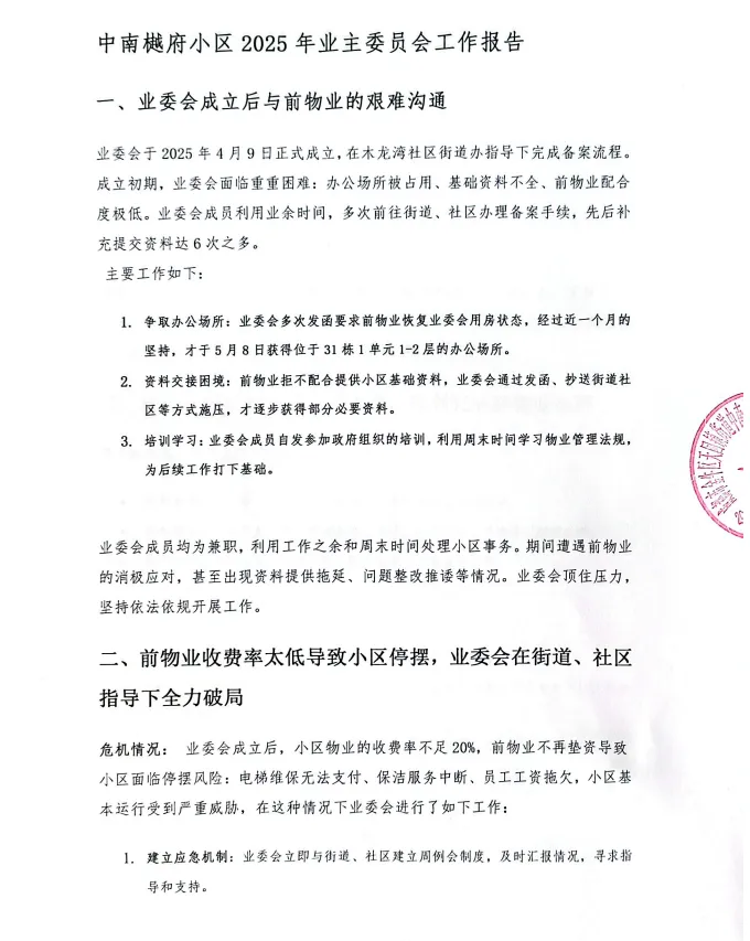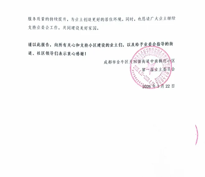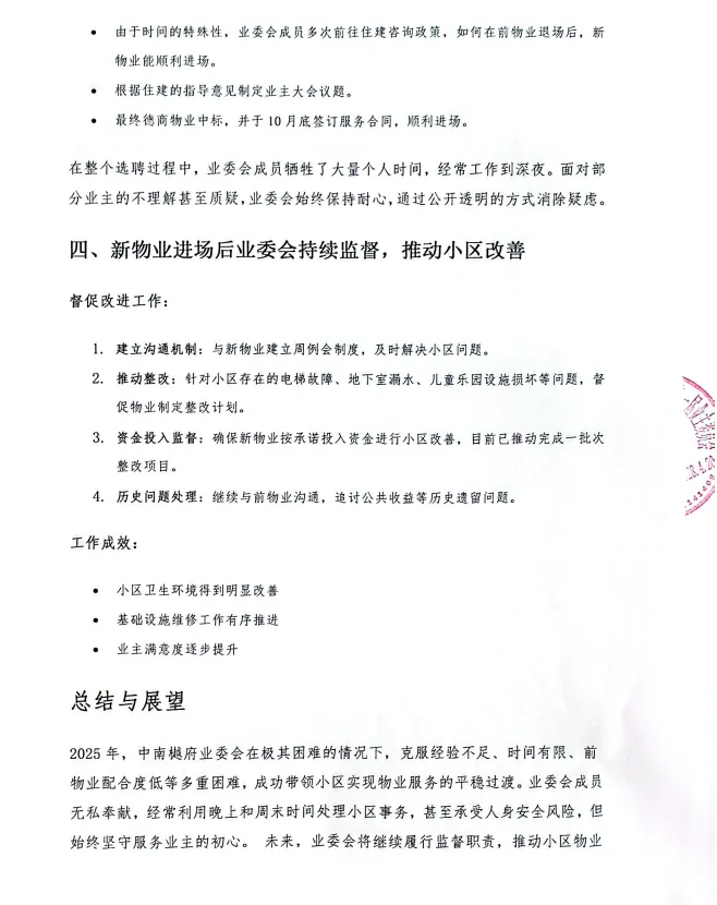 2025年,中南樾府业委会在极其困难的情况下,克服经验不足、时间有限、前物业配合度低等多重困难,成功带领小区实现物业服务的平稳过渡。业委会成员无私奉献,经常利用晚上和周末时间处理小区事务,甚至承受人身安全风险,但始终坚守服务业主的初心。 未来,业委会将继续履行监督职责,推动小区物业服务质量的持续提升,为业主创造更好的居住环境。同时,也恳请广大业主继续支持业委会工作,共同建设美好家园。