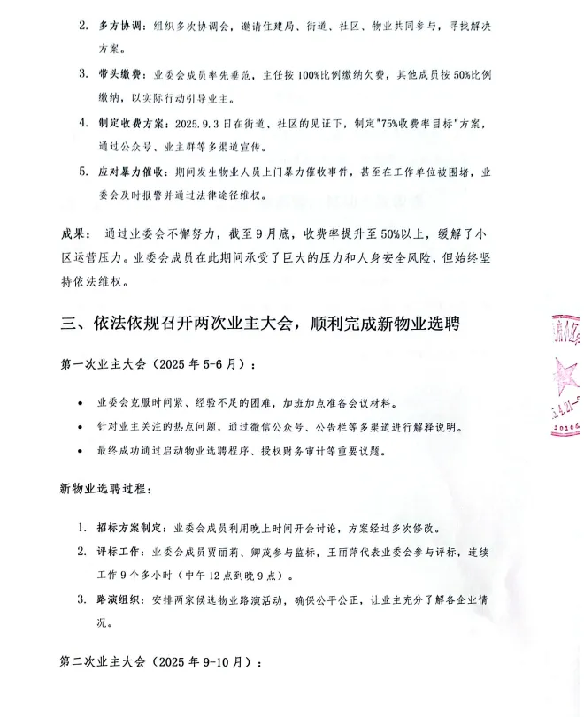 成果:通过业委会不懈努力,截至9月底,收费率提升至50%以上,缓解了小区运营压力。业委会成员在此期间承受了巨大的压力和人身安全风险,但始终坚持依法维权。
