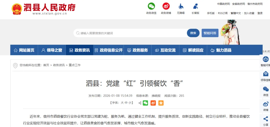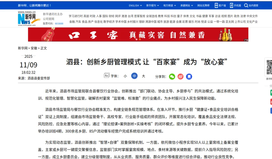 安徽日报推送专题文章《泗县:创新乡厨管理模式,让“百家宴”成为“放心宴”》;