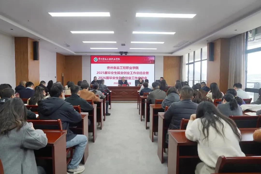 3月23日,贵州食品工程职业学院召开2025届毕业生就业创业工作总结会暨2026届毕业生就业创业工作启动会。学院党委书记彭光明出席会议并讲话,学院党委委员、副院长刘丹、朱国飞出席会议,学院党委委员、副院长刘作福主持会议并对2026届毕业生就业创业工作进行安排部署。