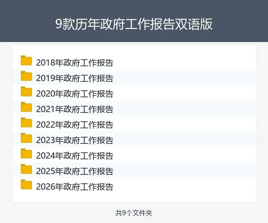 涵盖2018至2026年共9年中文报告,包含中英文双语对照版本,Word和PDF格式方便编辑阅读,内容准确可靠,适合英语学习、翻译参考和学习研究使用。