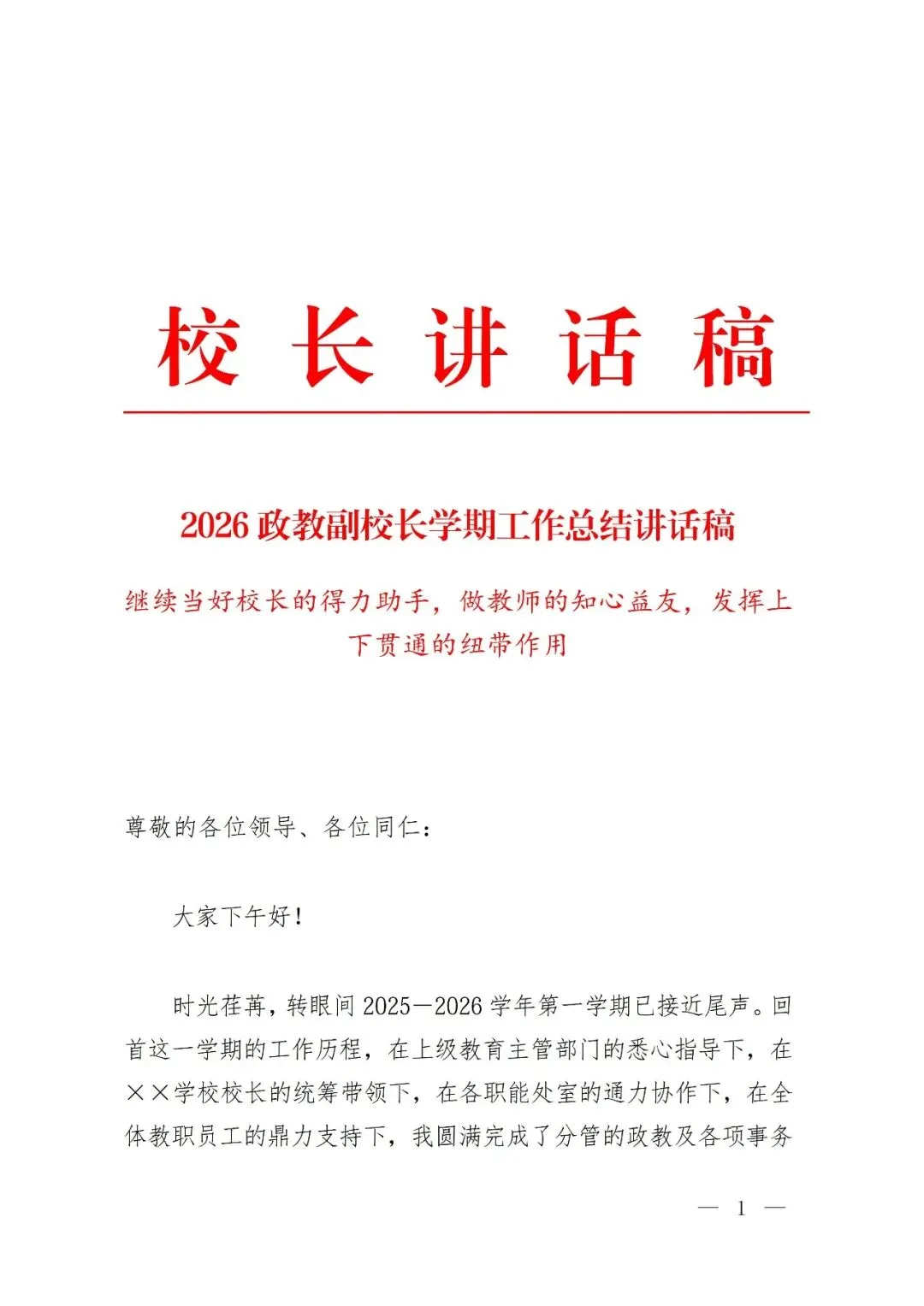 时光荏苒,转眼间2025-2026学年第一学期已接近尾声。回首这一学期的工作历程,在上级教育主管部门的悉心指导下,在××学校校长的统筹带领下,在各职能处室的通力协作下,在全体教职员工的鼎力支持下,我圆满完成了分管的政教及各项事务性工作。今天,怀着感恩与敬畏之心,向各位汇报我这学期的工作体悟与思考,汇报的主题是:继续当好校长的得力助手,做教师的知心益友,发挥上下贯通的纽带作用。