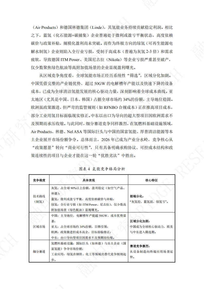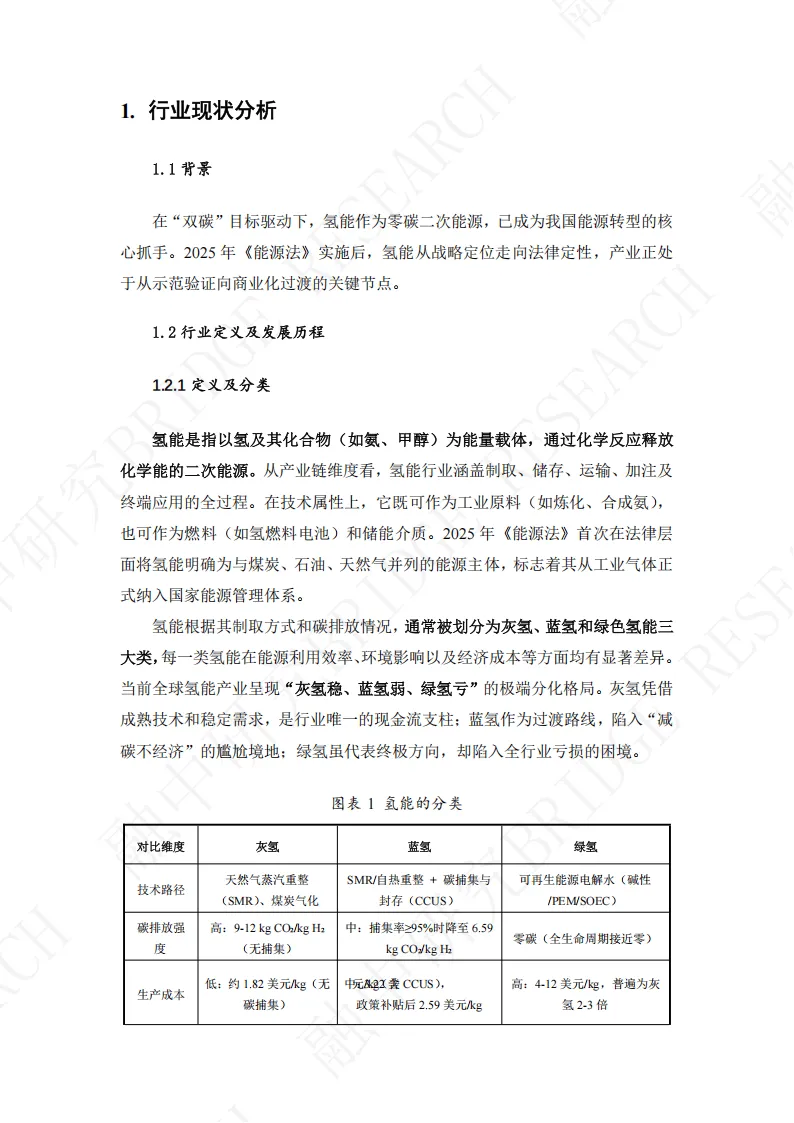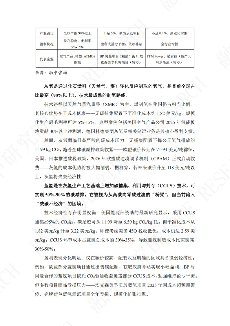 2026年政府工作报告首提“未来能源”,氢能作为零碳二次能源,在“双碳”目标与2025年《能源法》实施背景下,从战略定位走向法律定性,进入从示范验证向商业化过渡的关键阶段。氢能按制取方式和碳排放分为灰氢、蓝氢、绿氢,当前全球呈现“灰氢稳、蓝氢弱、绿氢亏”的格局:灰氢占全球产能90%以上,技术成熟且盈利稳定,但面临碳成本压力;蓝氢作为过渡路线,因CCUS环节推高成本陷入“减碳不经济”;绿氢为零碳终极方向,却受高成本制约全行业亏损。