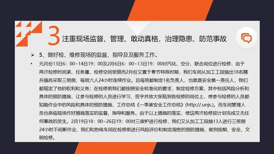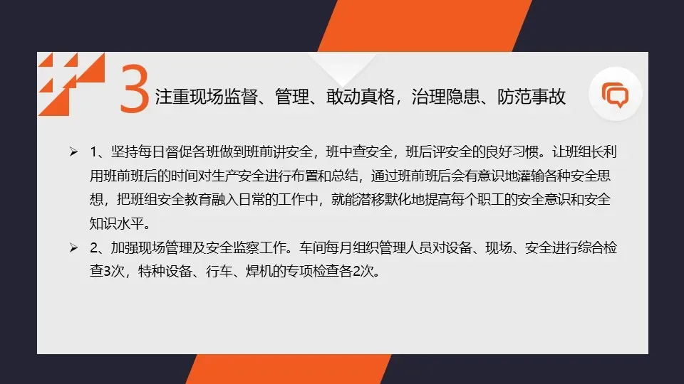 我们加强了对生产现场的安全隐患排查和治理工作,及时发现和整改了一批安全隐患。同时,我们还加强了对危险源的监控和管理,确保了企业的安全生产。