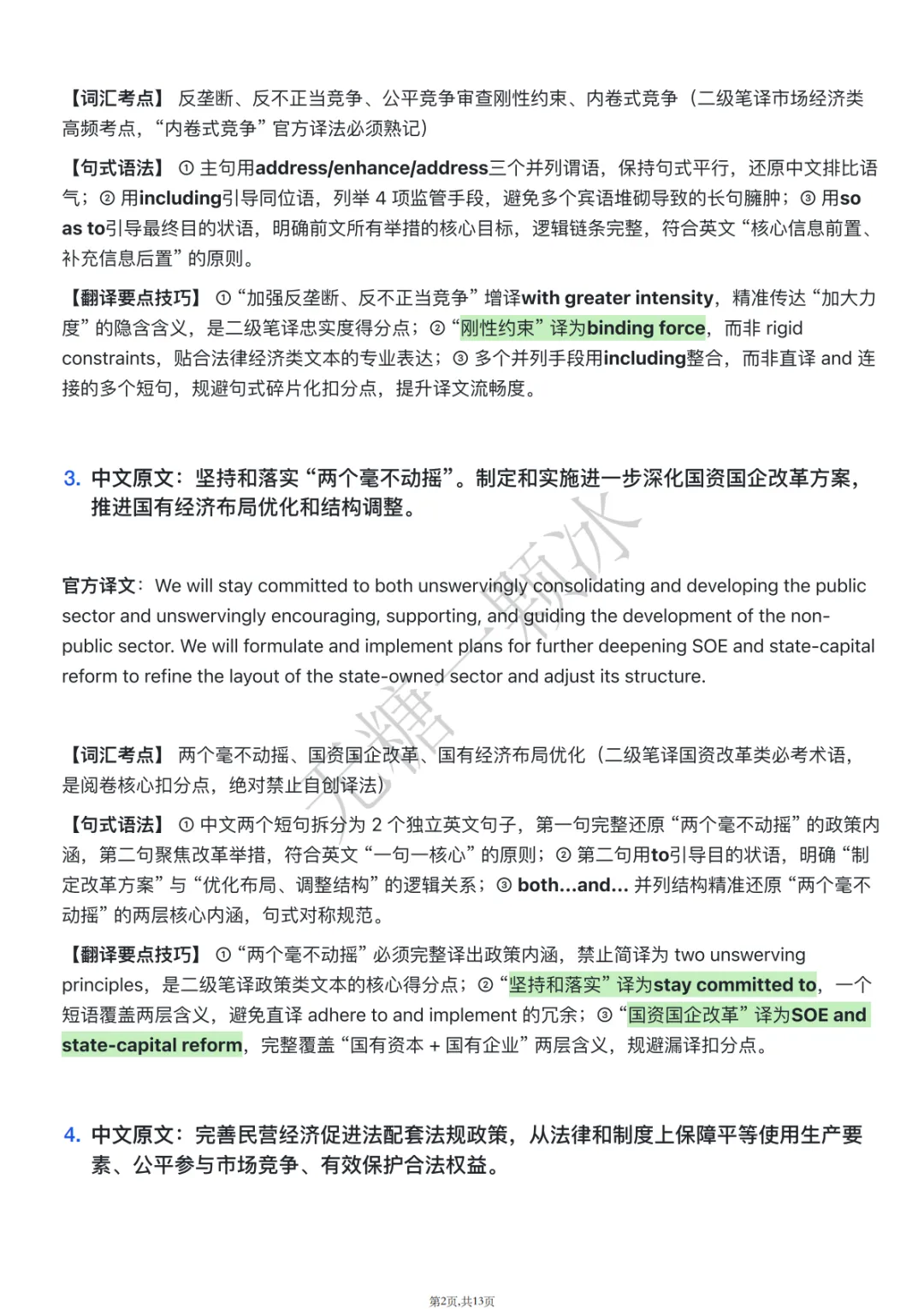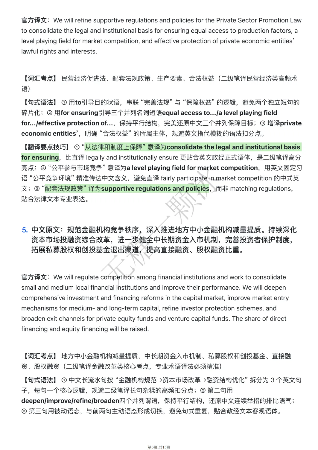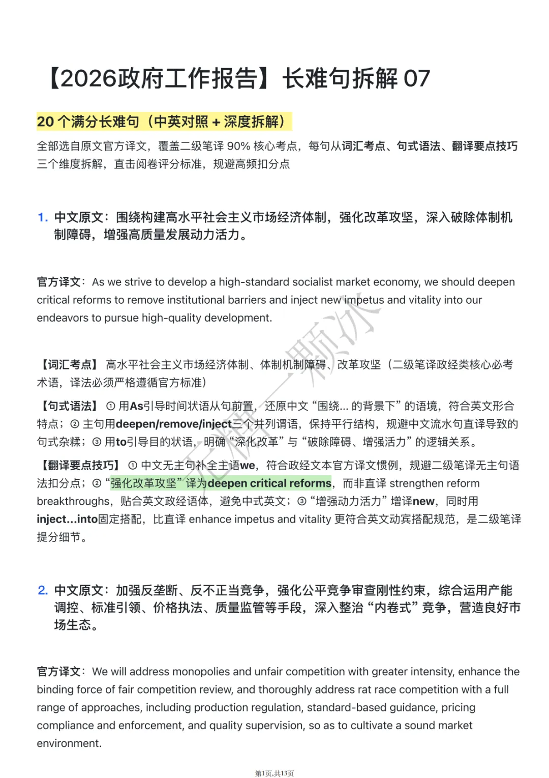 全部选自原文官方译文,基于2026政府报告双语PDF,已经整理分享的中英双语对照版第61-74页内容,主要是2026政府工作任务的第四至六部分,每句拆解词汇考点 + 句式语法 + 翻译要点
