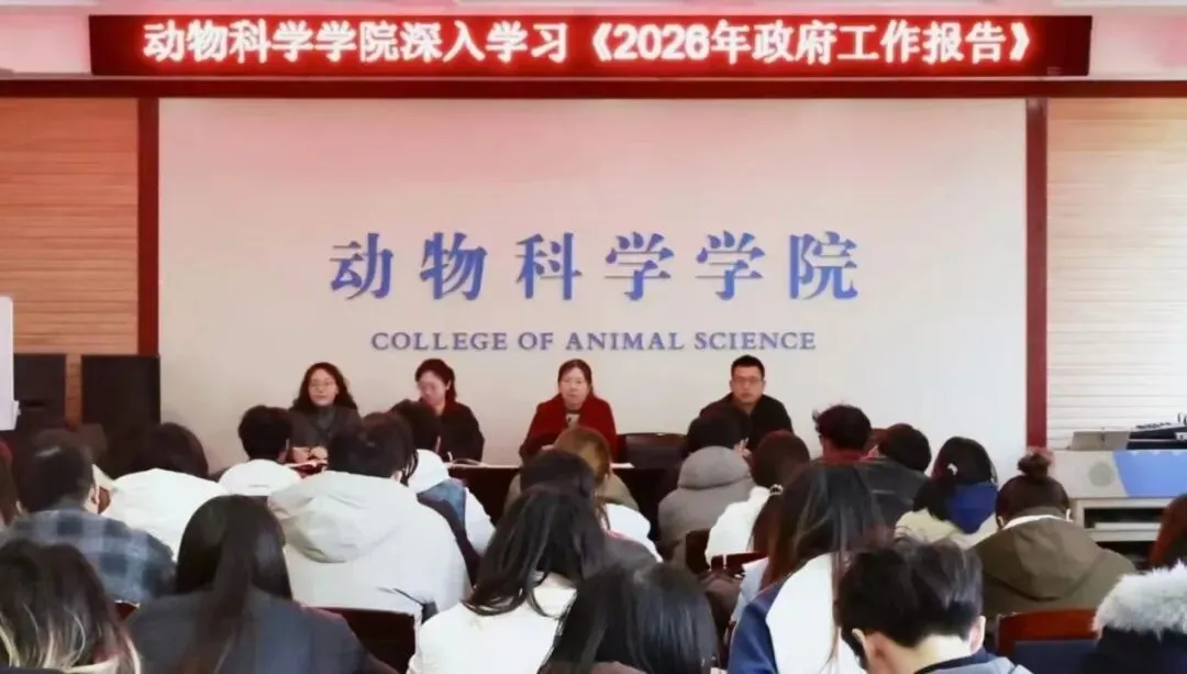 3月11日,动物科学学院在动科楼大会议室深入学习《2026年政府工作报告》。会议由分团委副书记贺鹏宇主持,分团委全体老师、各班班委参加会议。