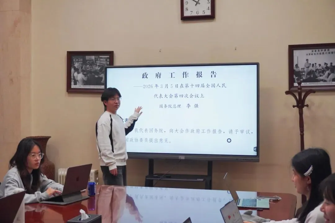 为学习贯彻全国两会精神,2026年3月9日晚,中国人民大学法学院学生会召开理论学习会,深入学习政府工作报告并展开热烈交流讨论,各部门骨干代表就学习成果发表心得。