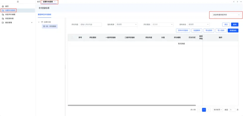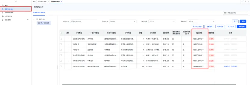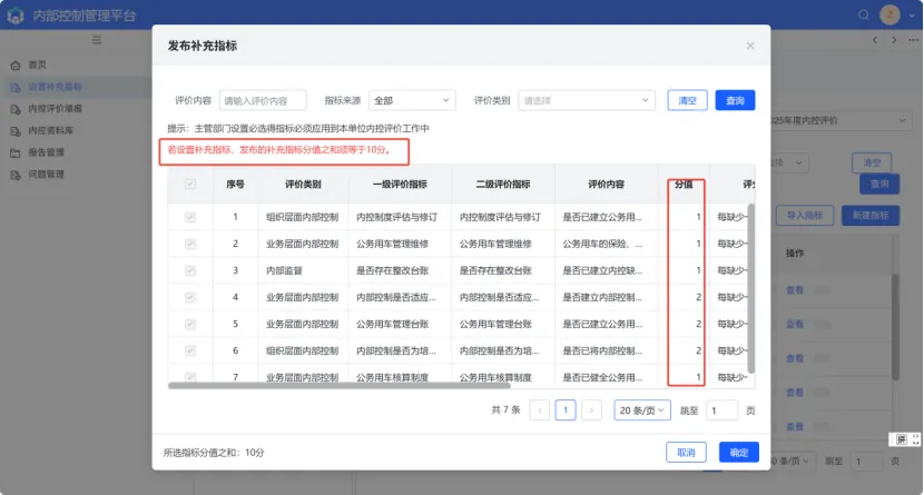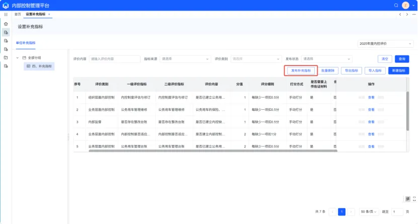 五、点击【发布补充指标】,弹出发布补充指标窗口,将补充指标发布至内部控制评价填报界面。