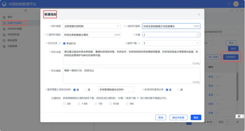 评价类别需选择组织层面内部控制、业务层面内部控制、内部监督中的一个。一级评价指标、二级评价指标、评价内容、评分细则需填写具体内容。分值输入1至10的整数。