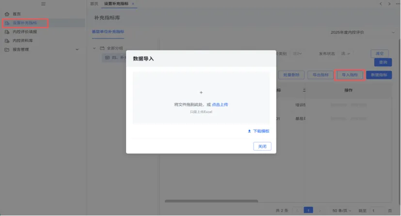 四、除通过新建指标的方式设置补充指标外,单位也可通过导入的方式设置补充指标。点击【导入指标】,弹出数据导入窗口,点击窗口中的【下载模板】,按照模板要求,设置补充指标后,点击【上传】,上传要导入的补充指标。