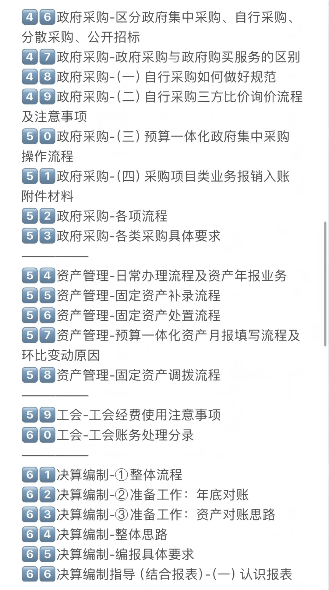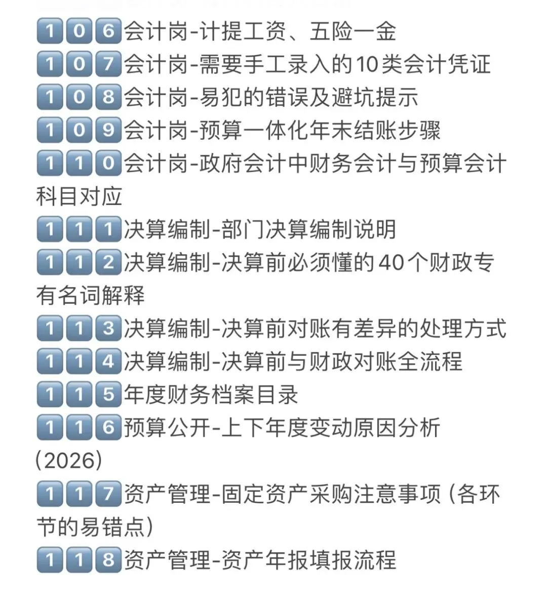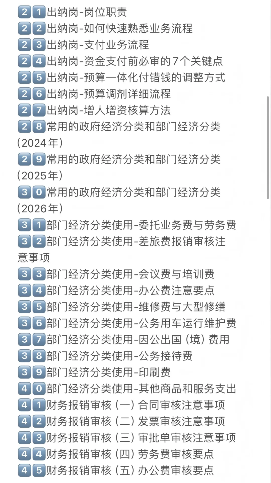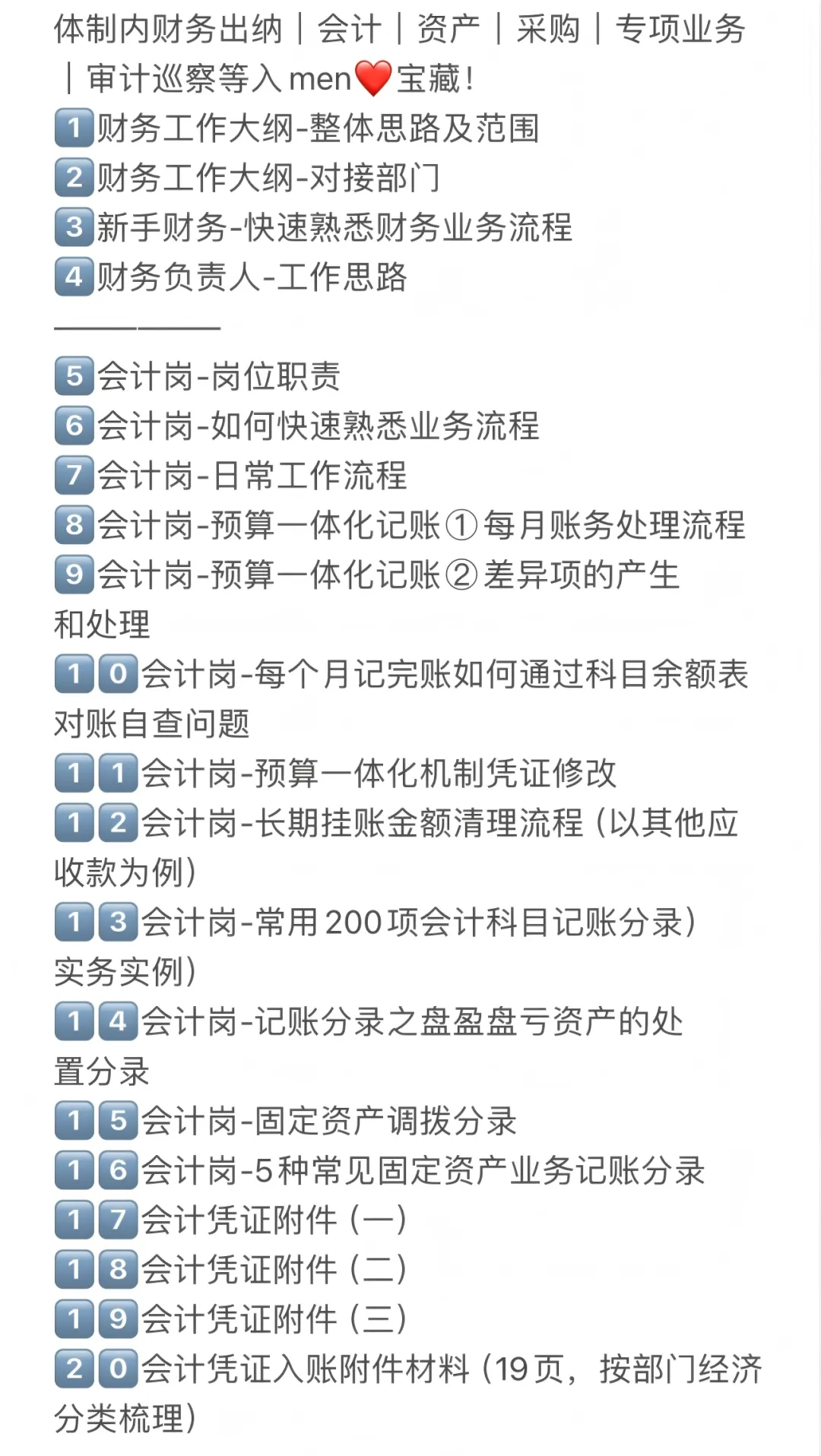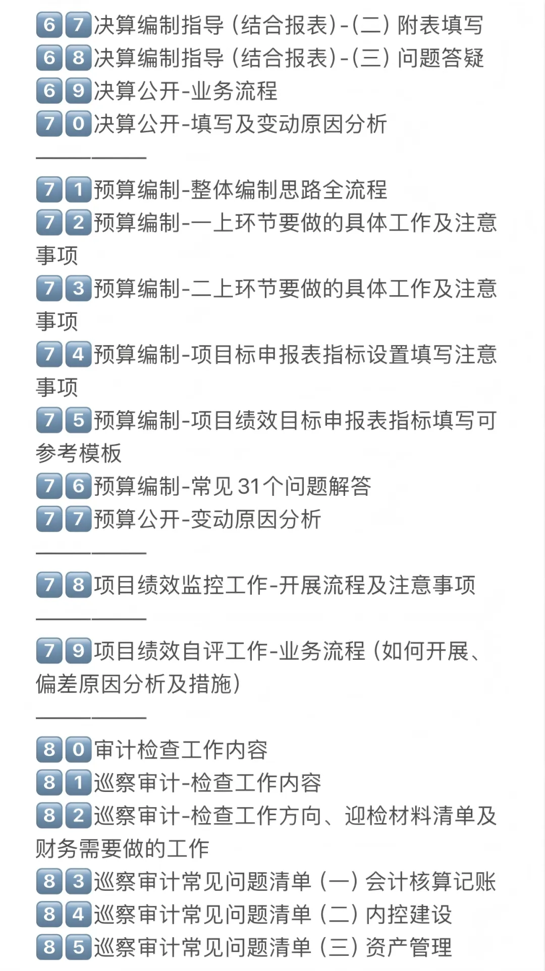辣辣参加工作13年,财务负责人,一对一指导300➕财务小伙伴。在这个过程里,辣辣也根据业务实操,结合小伙伴们的高频问题点,整理了一套涵盖出纳、会计、资产、采购、审计、预决算编制、财报等各类专项业务的知识库!知识库是什么👇
