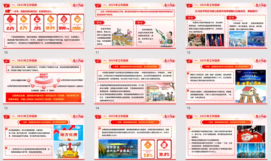 最新推出的《2026年全国两会政府工作报告重点内容学习》PPT课件,系统梳理报告四大核心板块,详细解析2025年工作成效、“十五五”主要目标、2026年政策取向及政府工作任务。页面精致美观,图文搭配合理,内容扎实完整,数据精准无误,逻辑清晰明了。