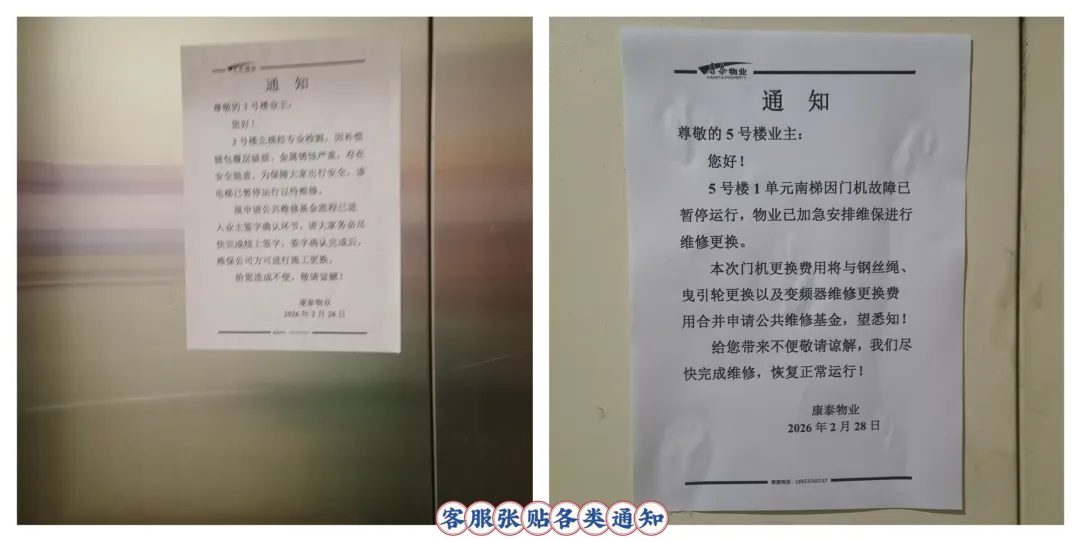 2月7日周末一场降雪,雪势虽不大地面也覆盖了一层,虽未堆积深厚,但足以湿滑难行,物业值班人员对主要出入口,单元门口台阶及时清扫,保证业主安全通行。当春节的喜庆氛围日渐浓厚,归家团圆的脚步愈发急切,电梯作为城市生活中不可或缺的垂直纽带,承载着每一位住户往返家门、奔赴团圆的期盼。其安全运行,不仅是节日祥和的基础保障,更是物业责任与担当的直观体现。一场全面细致的节前电梯安全检查,便是我们送给业主最温暖的“平安年货”春节前物业组织安全专项检查,全面覆盖排查临街商铺、餐饮门店、地下车库等场所的消防、用气、用电安全以及公共区域安全隐患,当场整改并清零风险;确保设备机房节日期间正常运行。全力保障节日期间安全、稳定、有序,让辖区居民度过一个平安、祥和的假期。