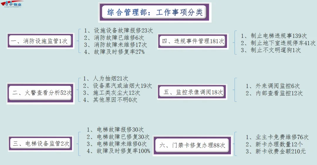工作人员每天为业主提供热情、周到的服务,同时加强与业主的沟通,了解业主的需求和建议,不断提升服务质量。一、接待来电、来访1000余次;主要为反应外来人员进出、保洁问题、电梯问题、走廊灯不亮、对讲不好用、车位被占、查看水电表、储藏室灯不亮锁坏、业主家中水电维修、业主户内窗打不开关不上、办理空置房手续;更换车牌号、下水管道堵塞、开挂暖气阀、暖气不热等事宜。