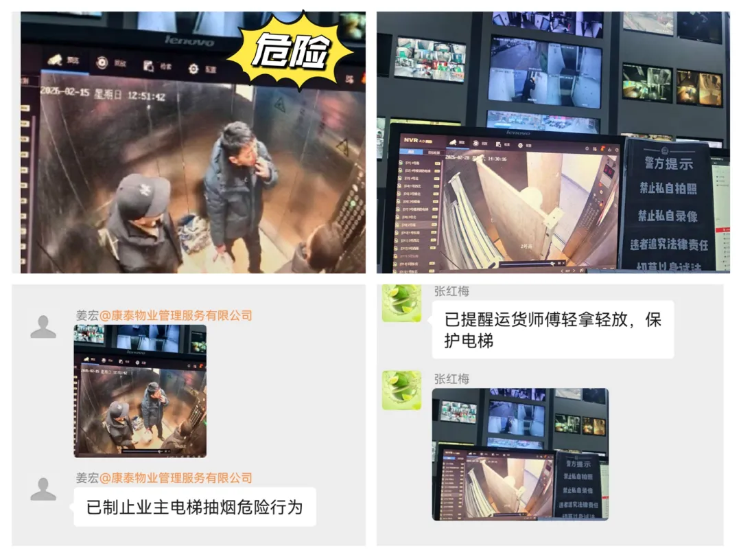 监控室每日对电梯内吸烟等危险行为作出警示并及时制止;提醒运货师傅轻拿轻放,保护电梯。