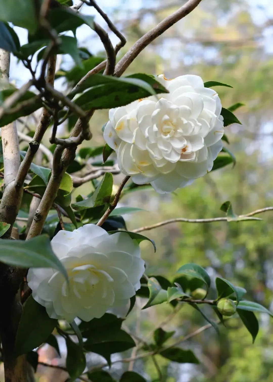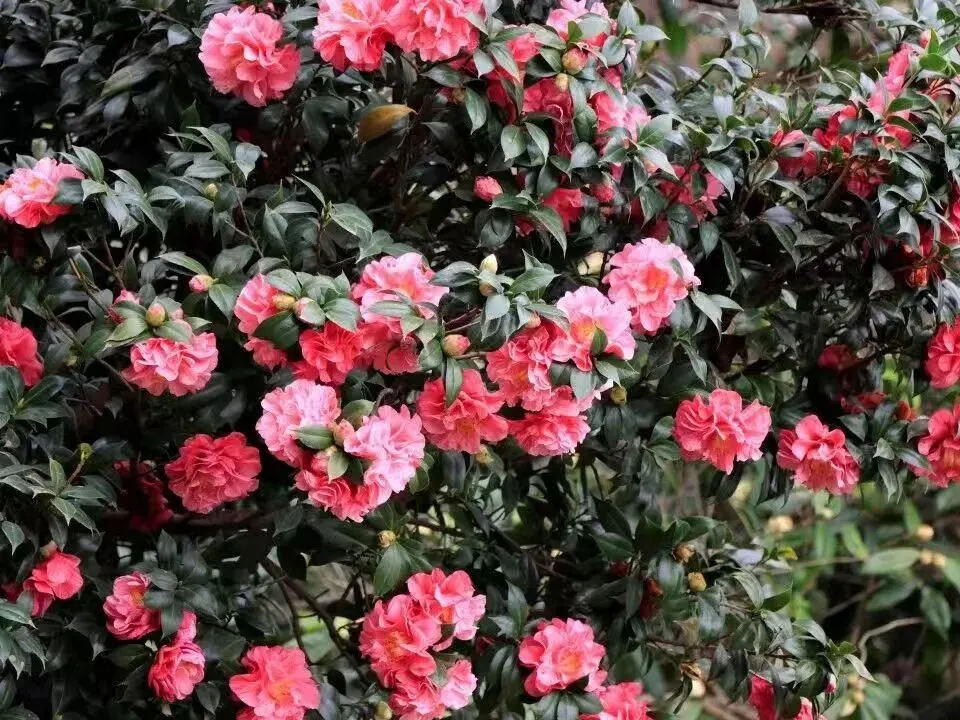 现在的茶花园正值最佳观赏期,粉、白、红各色茶花竞相绽放,不少枝头还是含苞待放的模样,错落有致的美感刚刚好!