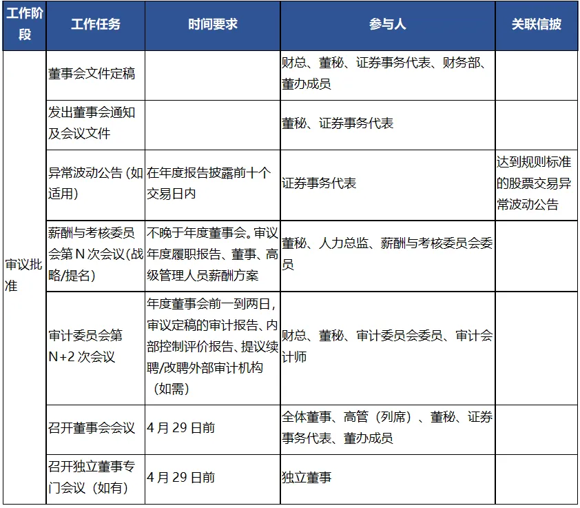 我们注意到年报相关汇报涉及多位领导,在邀请领导汇报时,需提前将对应议案介绍发送给汇报领导,以便他们做好准备。同时,议案分工不仅要明确到具体负责部门,还需落实到具体经办同事;若涉及中介机构需提供文件支持,应将中介机构的具体负责人及所需文件清晰列于议案分工表中。
