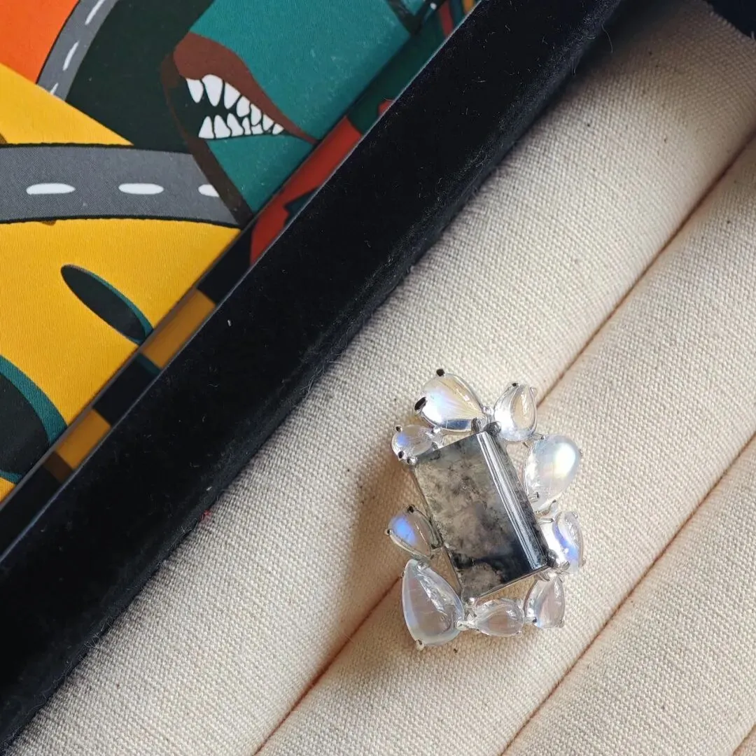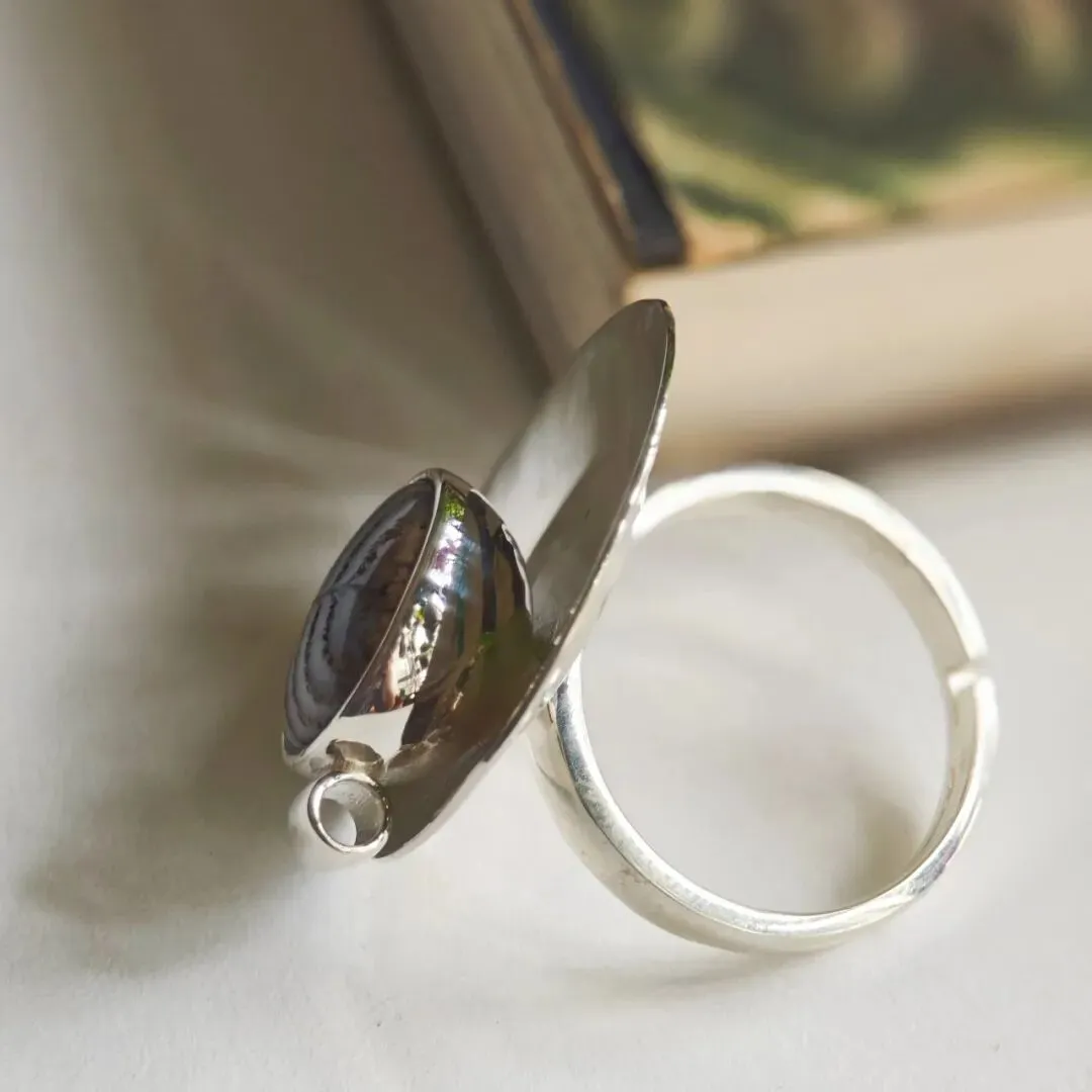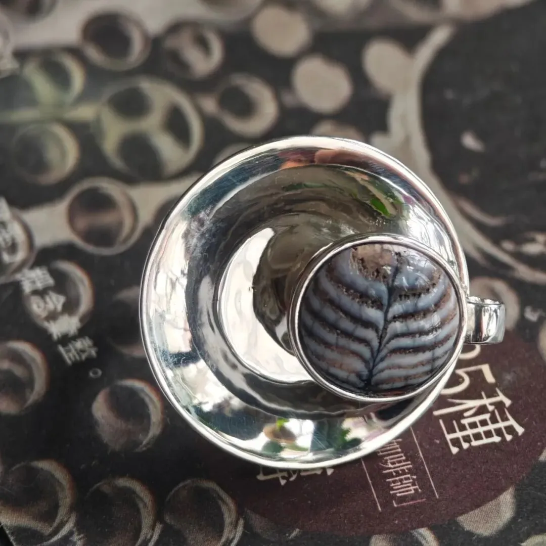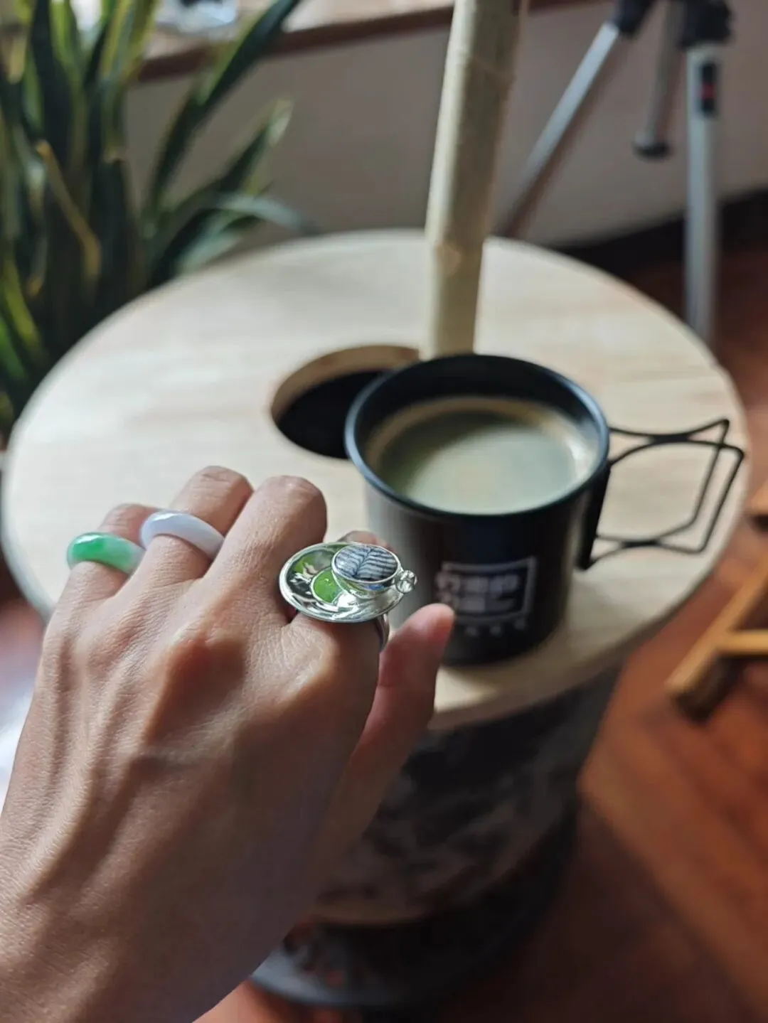 首先是用蛇纹化石模拟咖啡拉花的戒指。