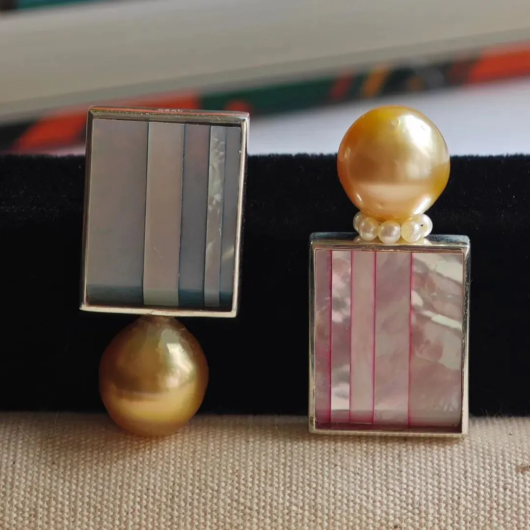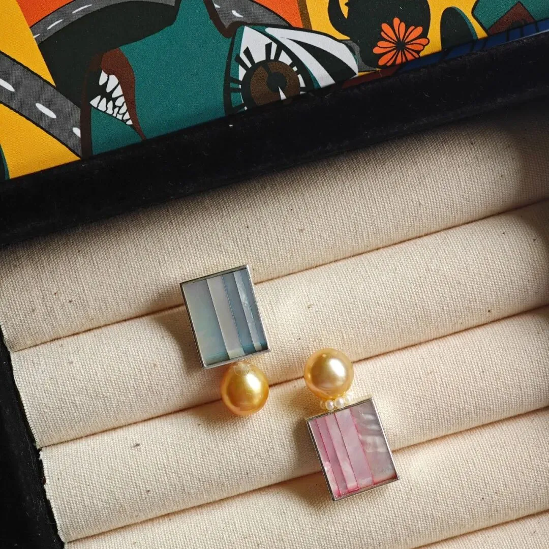 这对蓝和粉形制一样颜色不一样,就和南洋金珠做了AB款的耳钉,起名叫“海军蓝和香水瓶”。我记得之前Tous有一款小熊香水就是这么粉嘟嘟的。但要说造型,更像爱马仕的twilly吧。
