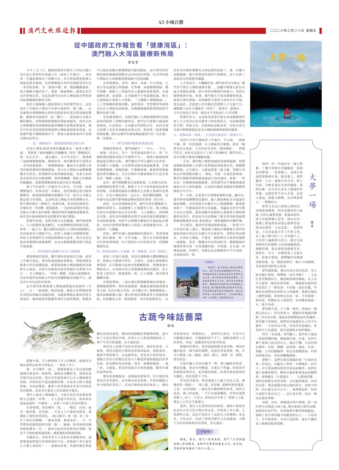 回到今年的中國政府工作報告,可以說,「健康中國」與「科技強國」在大灣區的交匯點,就是一個既有民生溫度、又有科技含量的「健康灣區」。 對澳門而言,如何在這張名片上留下更清晰的「澳門印記」,是未來數年發展的關鍵命題。