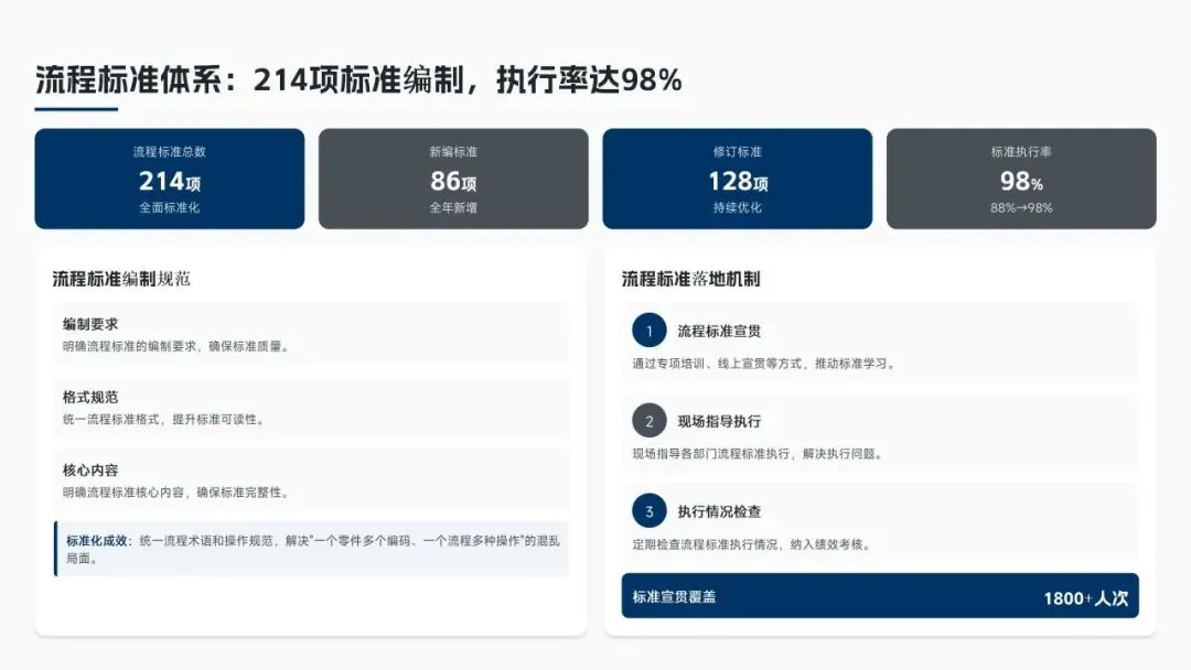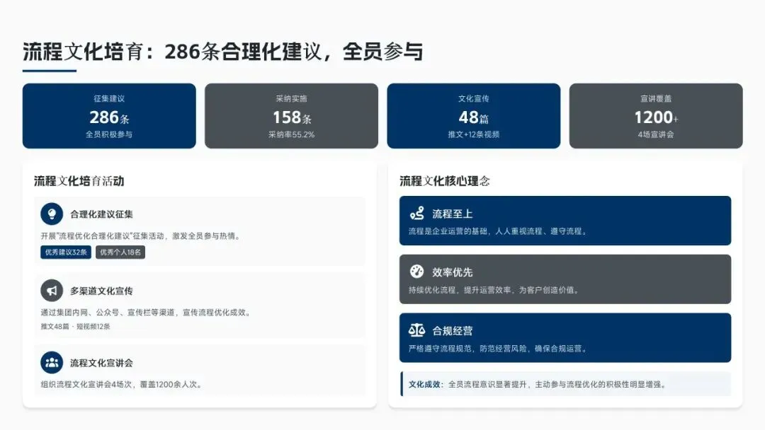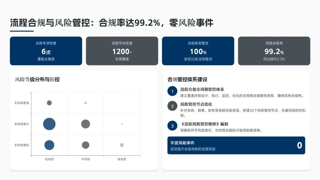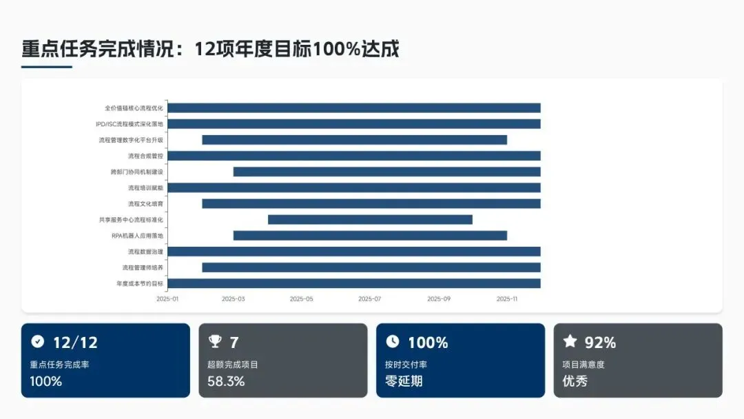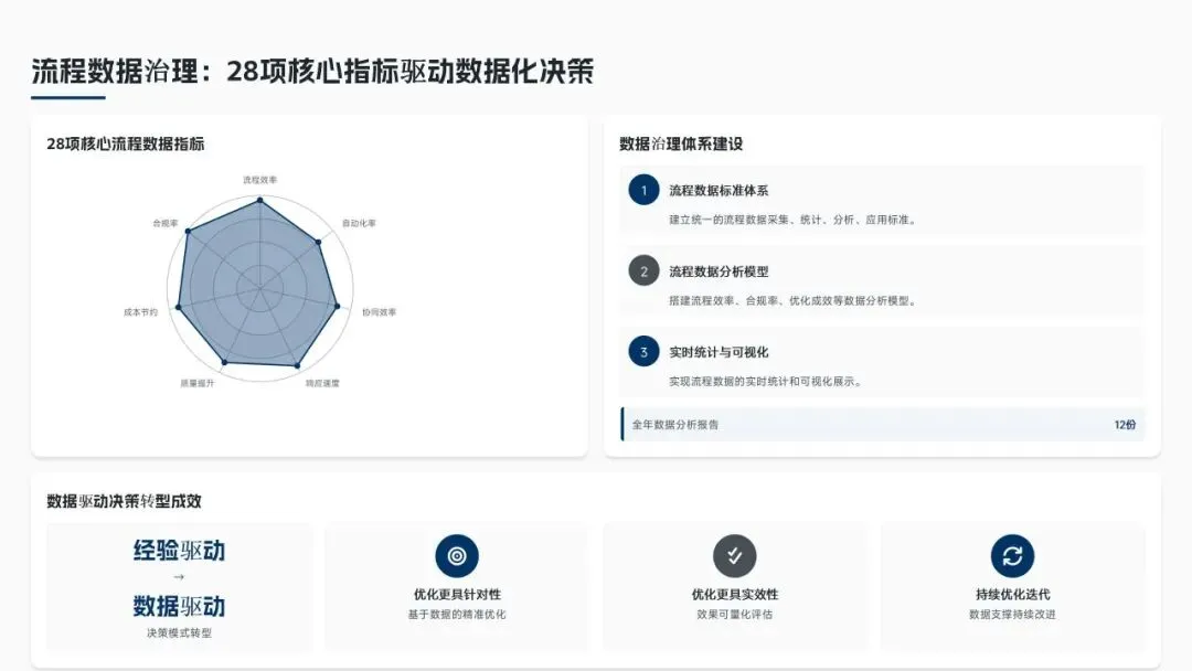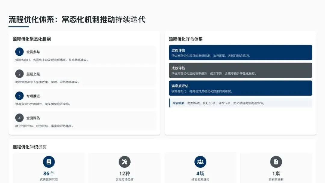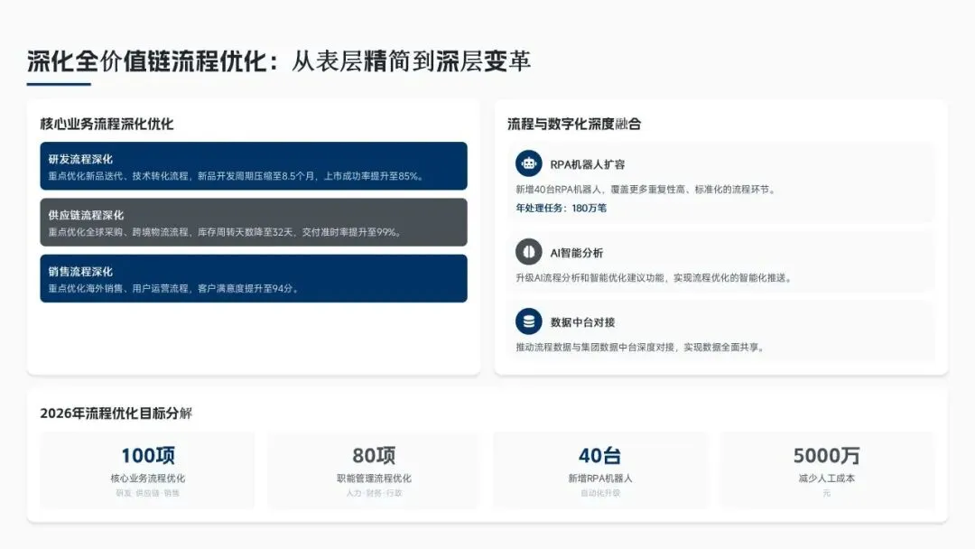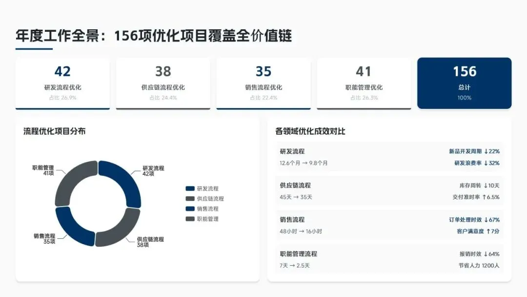 核心经营成果上,全年完成156项流程优化项目(超额30%),流程效率平均提升38%,实现总成本节约8.6亿元(超额7.5%),流程合规率达99.2%(同比+2.3%),12项年度重点任务100%达成,投资回报率达4.8:1。各核心领域流程优化关键指标成效如下表: