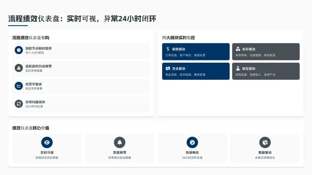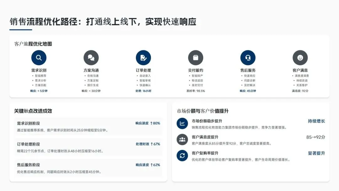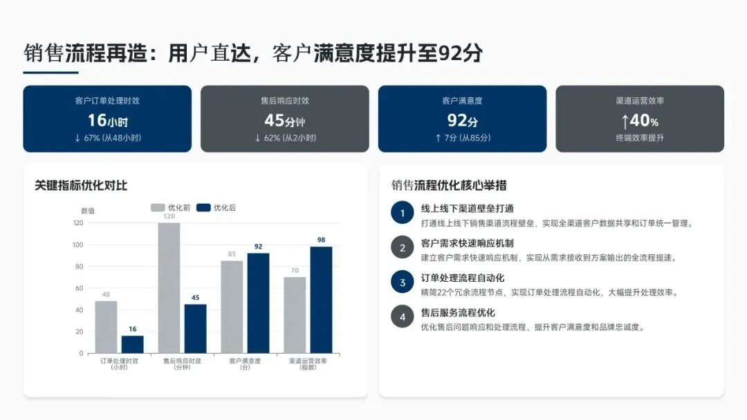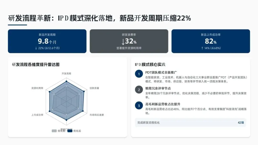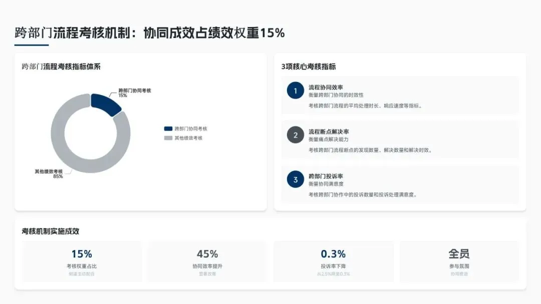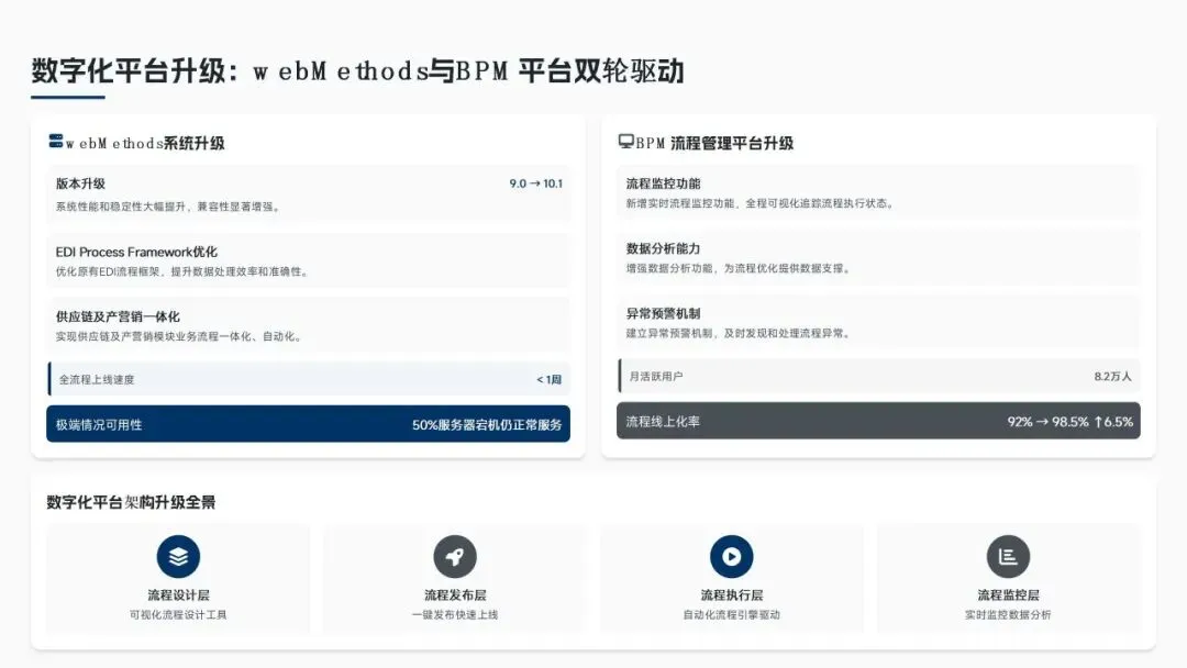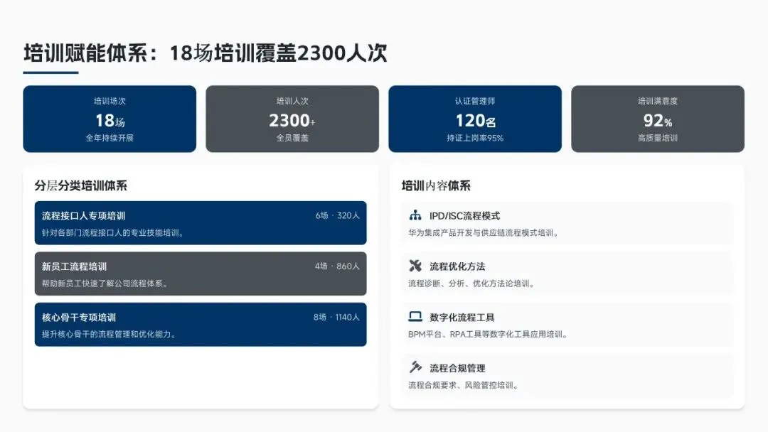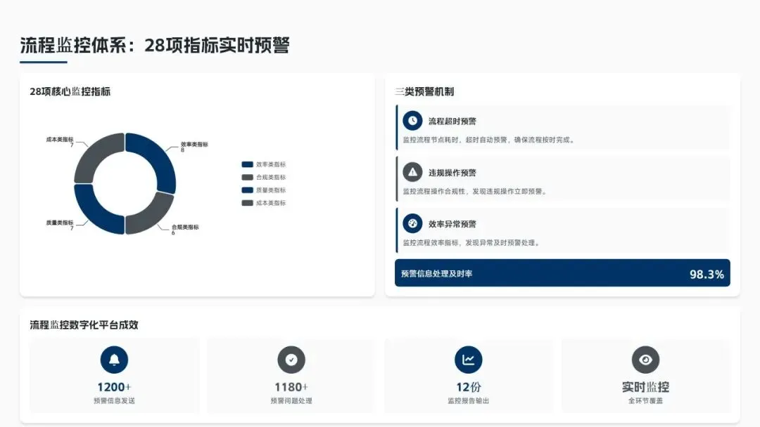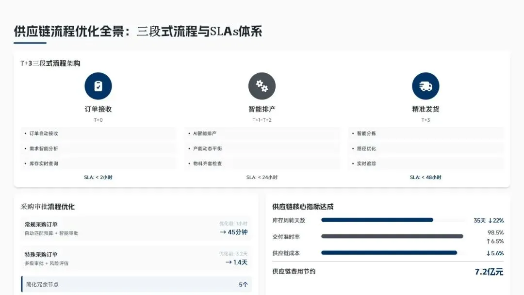 核心经营成果上,全年完成156项流程优化项目(超额30%),流程效率平均提升38%,实现总成本节约8.6亿元(超额7.5%),流程合规率达99.2%(同比+2.3%),12项年度重点任务100%达成,投资回报率达4.8:1。各核心领域流程优化关键指标成效如下表: