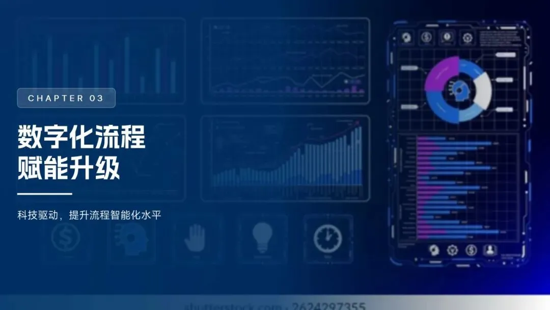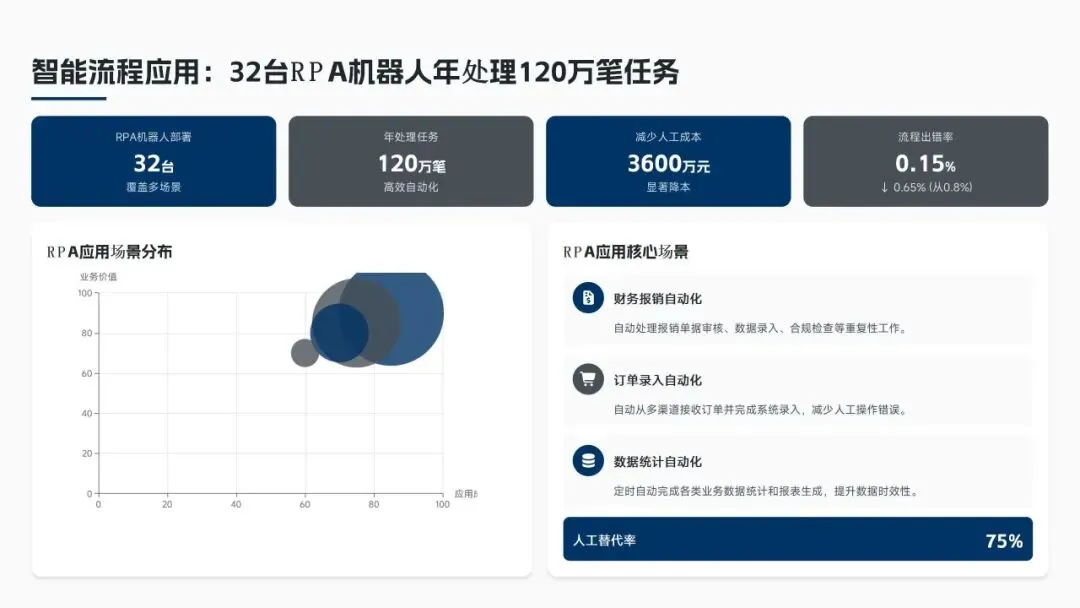 在数字化提升方面,实现了 WebMethods和 BPM平台的双重提升,实现了98.5%的业务流程在线化;部署 RPA机器人32台,每年完成120多万次作业,节约人力资源3600万;建立28个核心数据治理指标的流程绩效仪表板,24小时闭环处理流程异常。在跨部门合作机制创新方面,成立6个合作团队,解决了48个难点问题,客户投诉率下降88%,打通了端到端的流程,提高了45%的合作效率,在绩效考评中将合作效果作为15%的权重。
