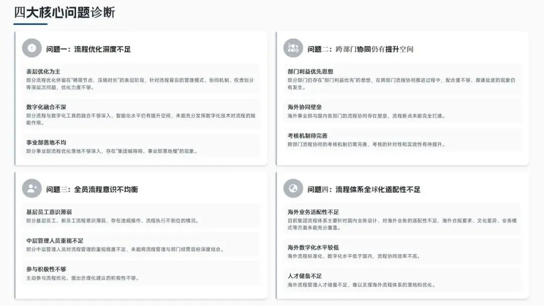 报告还提出了四个关键问题:过程优化大多是表面的,与数字技术的融合不够深入;跨部门合作中存在着部门利益至上、对外合作障碍重重的问题;全员对流程的认识不平衡,基层和中层对流程的认识不够;流程和体系的全球化适应性较差,海外数字和人力资源储备不足。
