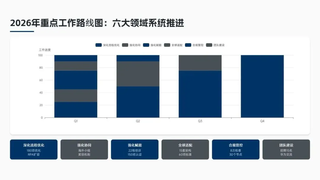 2025年流程管理部以“流程熵减·协同提效·体系赋能·数字驱动”为核心方向,完成全价值链流程优化革新,实现显著经营价值,同时搭建完善的流程管理体系,也明确了现存问题与2026年全球化发展的战略规划,为集团高质量增长提供了坚实的流程支撑。