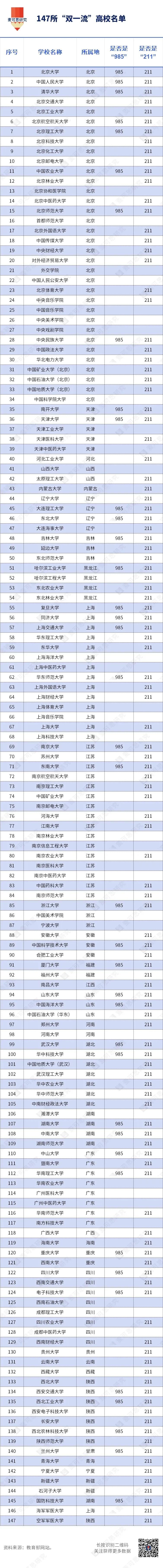 首轮建设(2016-2020年)共覆盖137所高校,其中42所为一流大学建设高校、95所为一流学科建设高校;2022年公布的第二轮建设名单扩容至147所高校,并作出重大调整——取消“一流大学/一流学科”的区分,转向更加突出分类发展的体系设计。