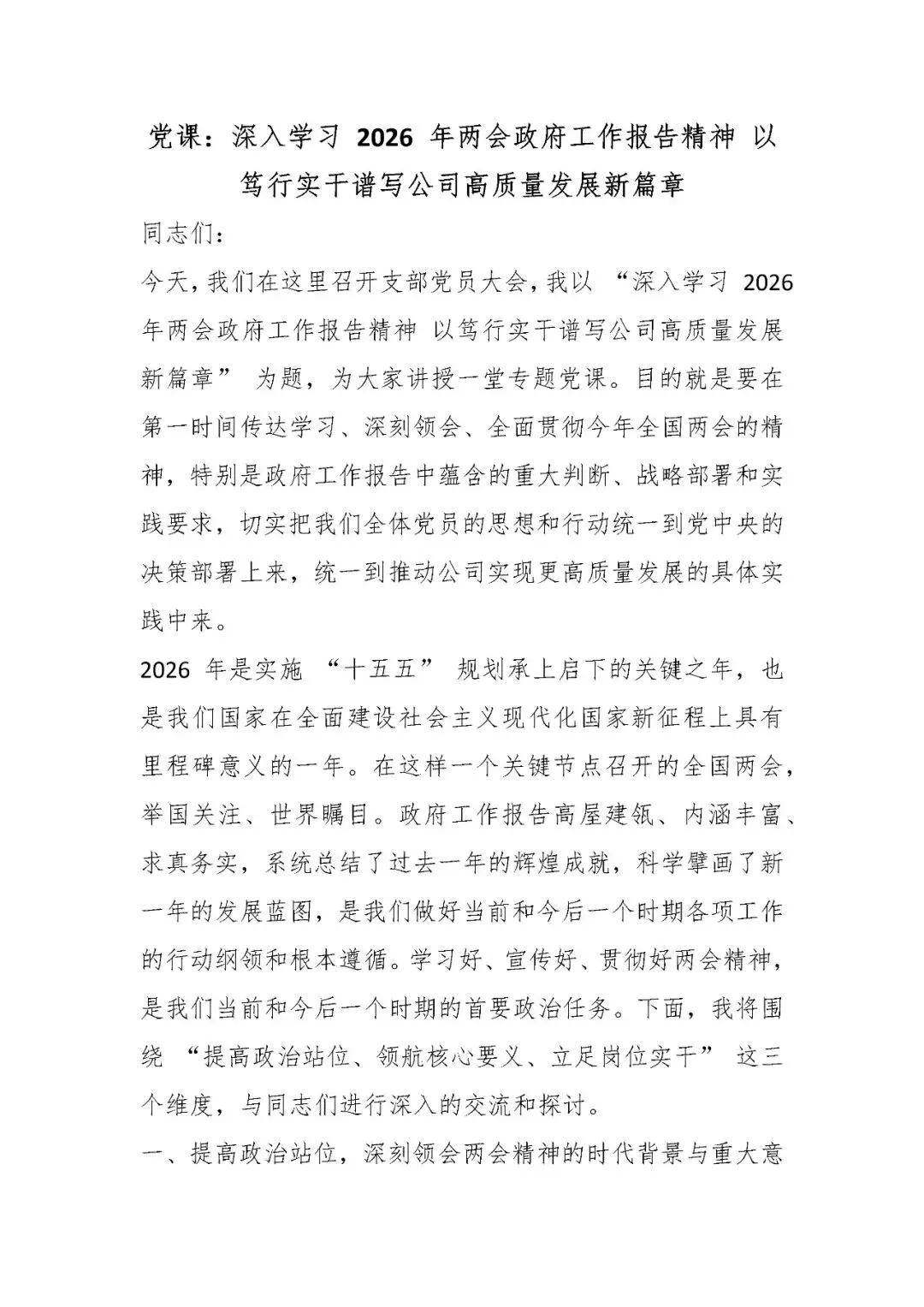 >党课:深入学习 2026 年两会政府工作报告精神 以笃行实干谱写公司高质量发展新篇章