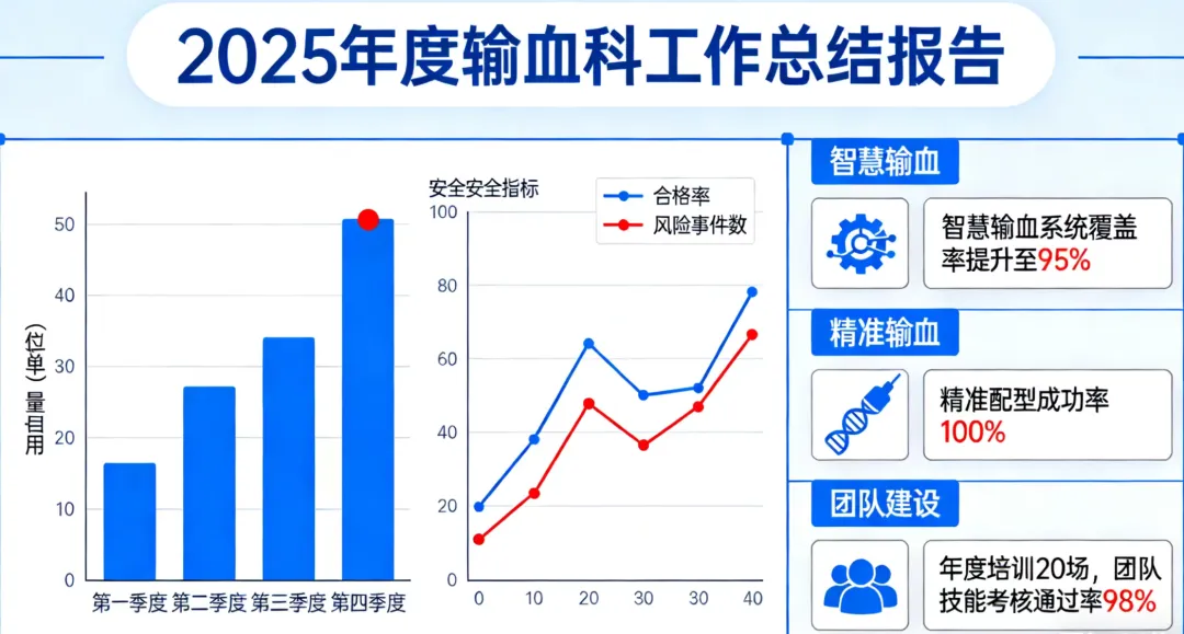 - 年度核心目标:血液供应及时率≥99%、输血相容性检测准确率 100%、输血不良反应发生率≤0.5%、临床满意度≥95%。