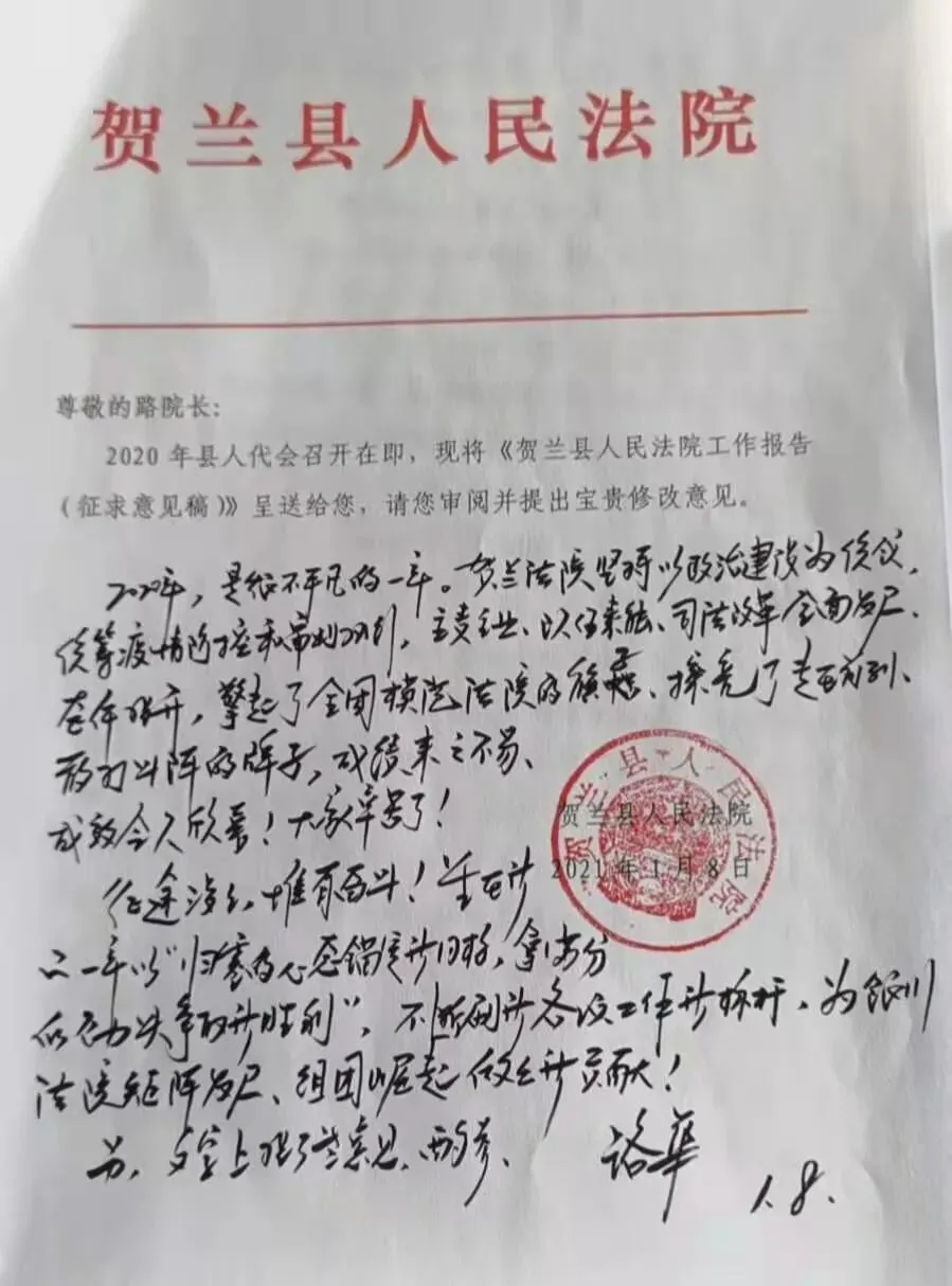 上级法院领导和贺兰县人大代表在审议贺兰县法院的工作报告时给予了高度评价,并对2021年工作提出了殷切期望和建设性意见建议。银川市中级人民法院党组书记、院长路华在审阅贺兰县法院工作报告后,批示:“2020年,是很不平凡的一年。贺兰县法院坚持以政治建设为统领,统筹疫情防控和审判执行,主责主业、队伍素能、司法改革全面发展、整体提升,擎起了全国模范法院的旗子,擦亮了走在前列、敢打头阵的牌子,成绩来之不易、成效令人欣喜!大家辛苦了!征途漫漫,惟有奋斗!望在新的一年以‘归零的心态锚定新目标,拿满分的劲头争取新胜利’,为银川法院矩阵发展、组团崛起做出新贡献!”