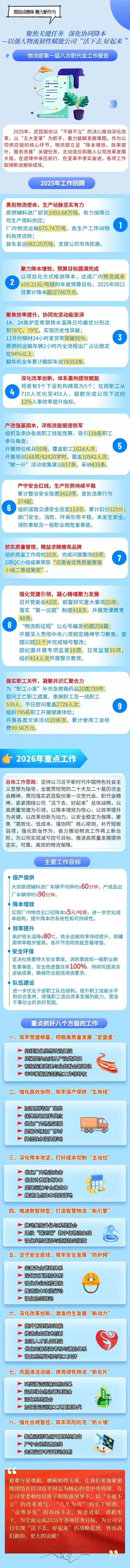 2月10日,物流部第一届八次职工代表大会胜利召开。会议全面回顾总结了过去一段时期的工作成绩与经验,深刻分析了当前面临的形势与挑战,为物流部高质量发展指明了方向。为让广大干部职工更直观、更快速地领会职代会精神,我们制作了职代会报告图解,图文并茂、干货满满,带您一图看懂报告中的关键点。