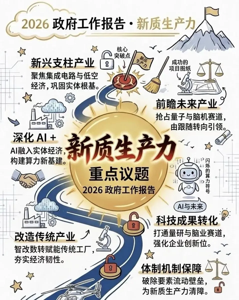 这组术语集中体现了政府工作报告中对未来产业、关键技术与创新能力建设的系统布局。