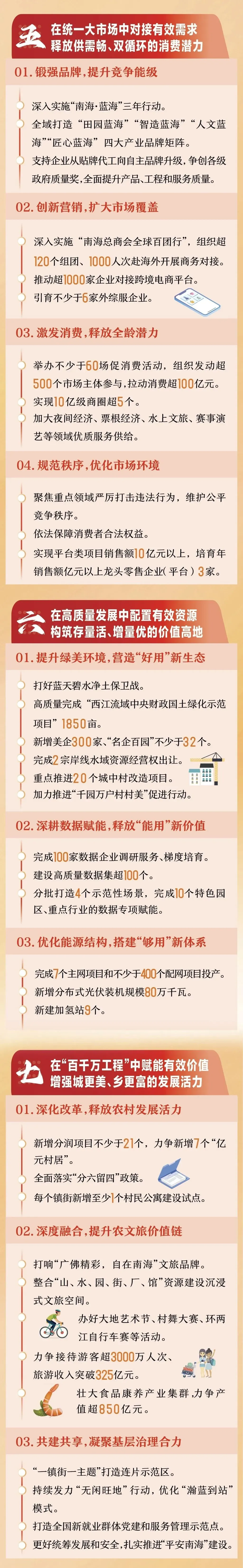 五、在统一大市场中对接有效需求,释放供需畅、双循环的消费潜力。持续释放内需潜力,拓展外需空间,在服务构建全国统一大市场、促进国内国际双循环中,提升南海产品竞争力、品牌影响力和市场渗透力。