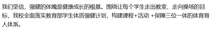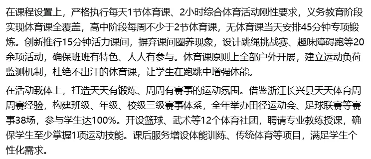 在保障支撑上,投入800万元升级体育设施,新建标准化足球场、室内体育馆,配齐运动器材,实现体育场地应开尽开。建立学生体质健康监测档案,对近视、超重等问题实施一人一策精准干预,联合医院制定个性化运动处方。2026年,我校学生体质健康优良率达82.5%,较去年提升6.3个百分点,近视率降至45.2%,实现四连降,超额完成年度防控目标。