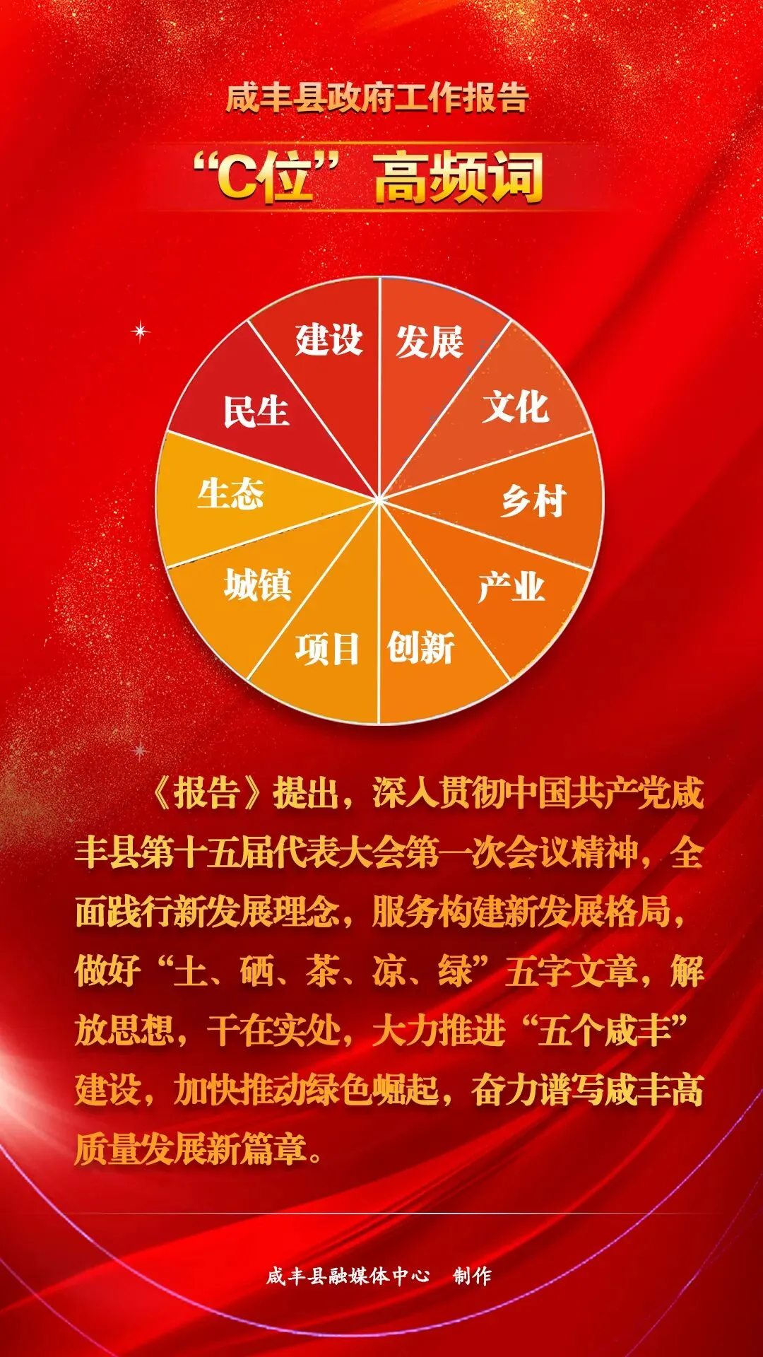 11月3日,咸丰县第十九届人民代表大会第一次会议召开,县委副书记、县人民政府代理县长覃正炜作政府工作报告。在18000多字的政府工作报告中,十大高频词解锁了咸丰县未来五年的工作重点和发展方向。