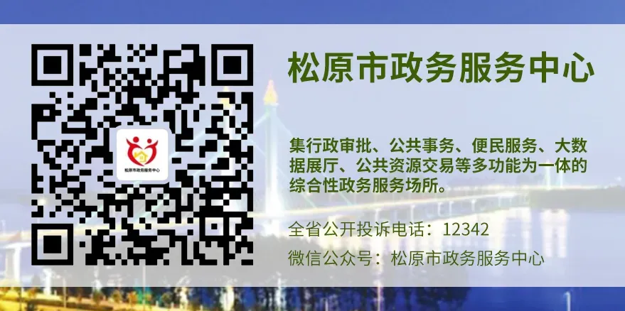扫上方二维码关注“松原市政务服务中心”,或点击屏幕右上方选择查看公众账号,点击关注,也可查找微信公众号“松原市政务服务中心”加入我们。