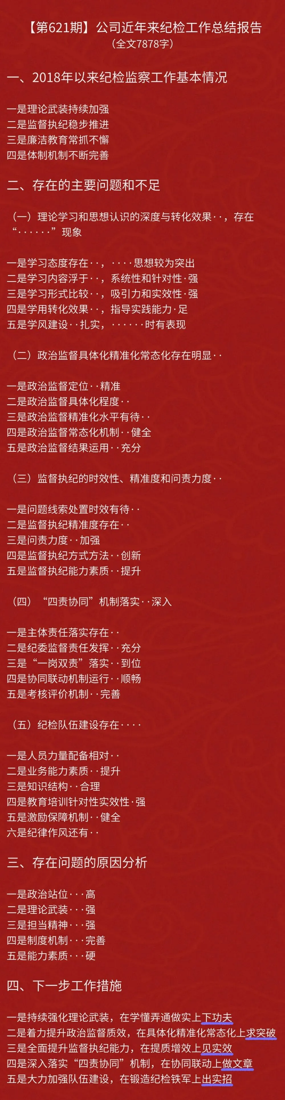 今天推荐一篇《公司近年来纪检工作总结报告》,全文7878字。文章开篇亮明背景,主体架构采用"四梁八柱"式布局——前两部分以"成绩+问题"构成镜像对照,后两部分以"根源+对策"形成闭环体系。在行文技巧上,善用"数据锚点"增强说服力,巧设"问题剖面图"直击要害,尤擅运用"排浪式递进"强化逻辑张力。全文