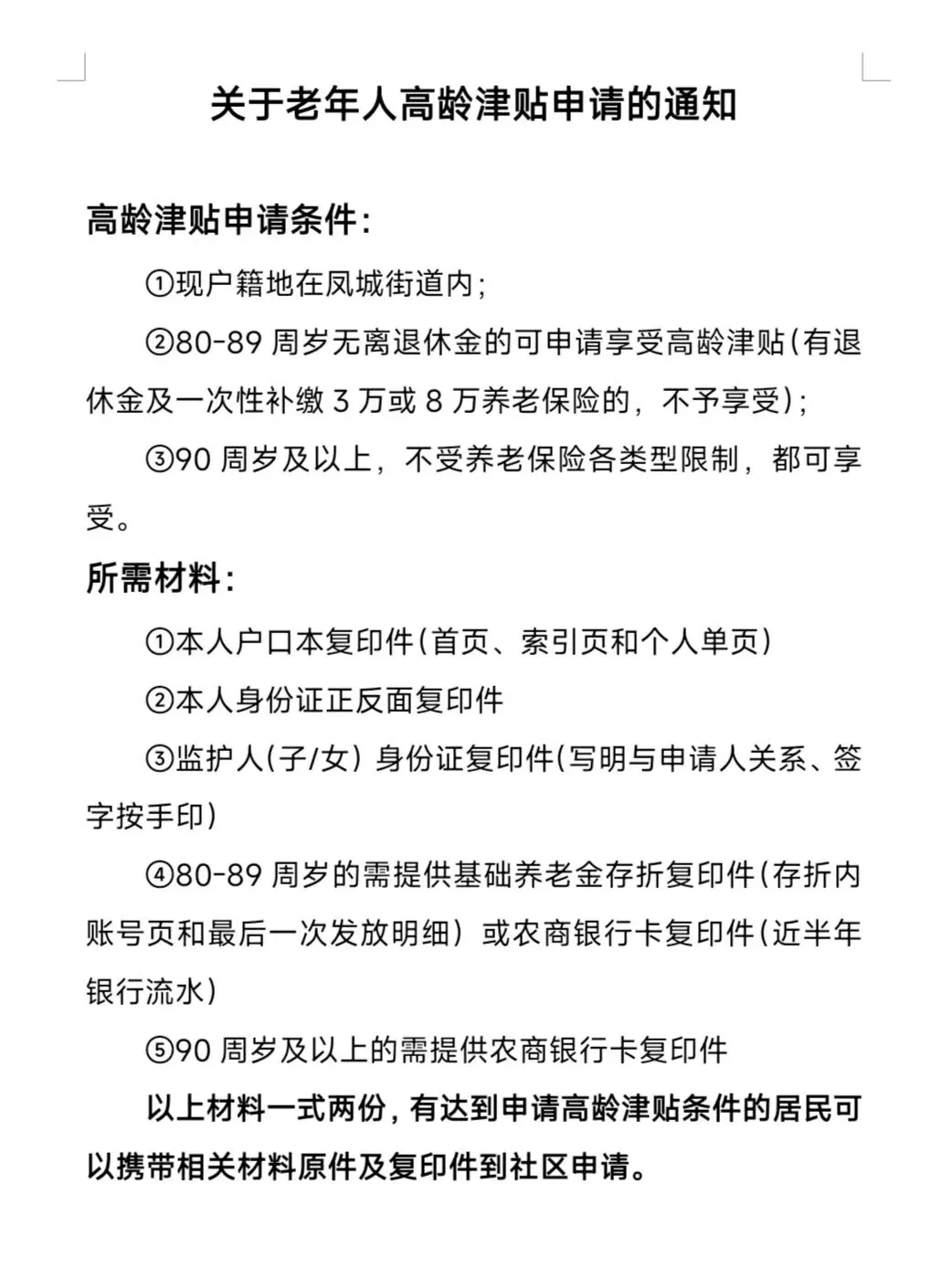 各位居民,现开始收取上报2026年第二季度(4-6月)符合高龄津贴人员的材料,请符合申领条件的居民携带相关材料及时到社区申报,之前未申请过、但符合条件的,也一并上报;申请过的,不再重复上报。