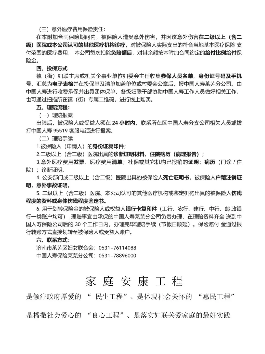 莱芜区妇联与中国人寿保险公司共同推出的一年一度“家庭安康”惠民保险开始了,这是一项面向广大家庭的暖心工程,主要包括重疾保险、交通意外身故/伤残保险和意外医疗费用保险,请大家仔细阅读图片内容,如有投保续保意向请拨打社区电话76233666或直接到社区大厅咨询办理。