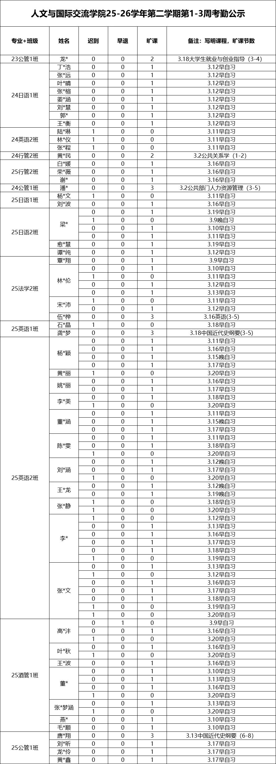 第1~3周考勤情况汇总