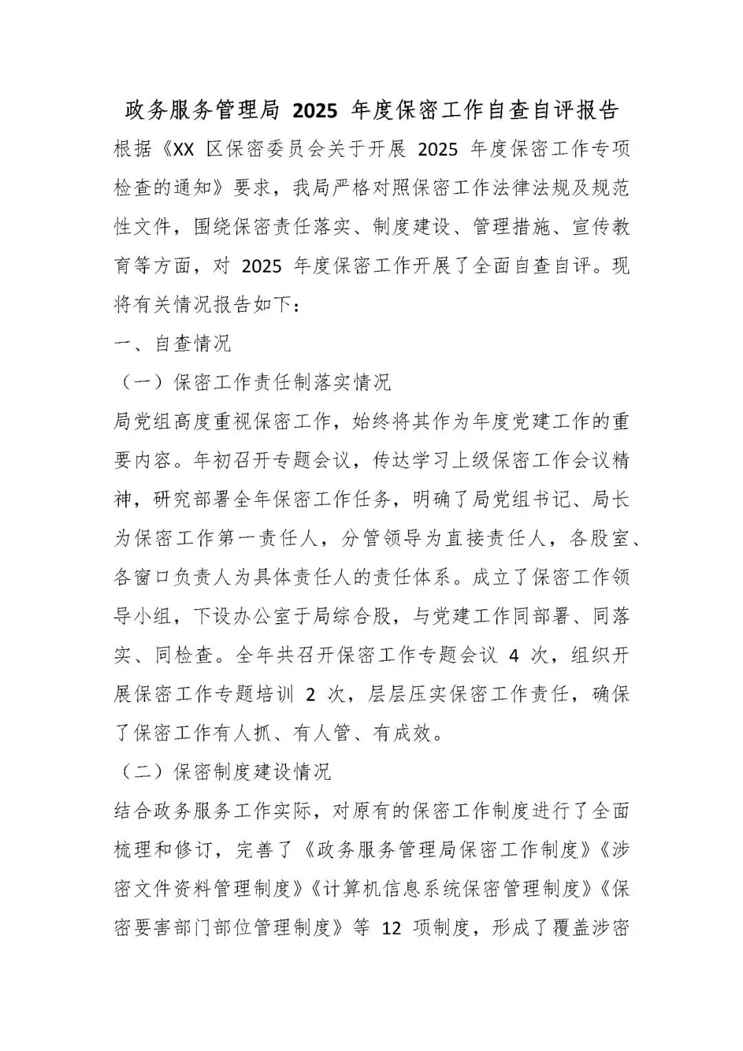 >政务服务管理局 2025 年度保密工作自查自评报告