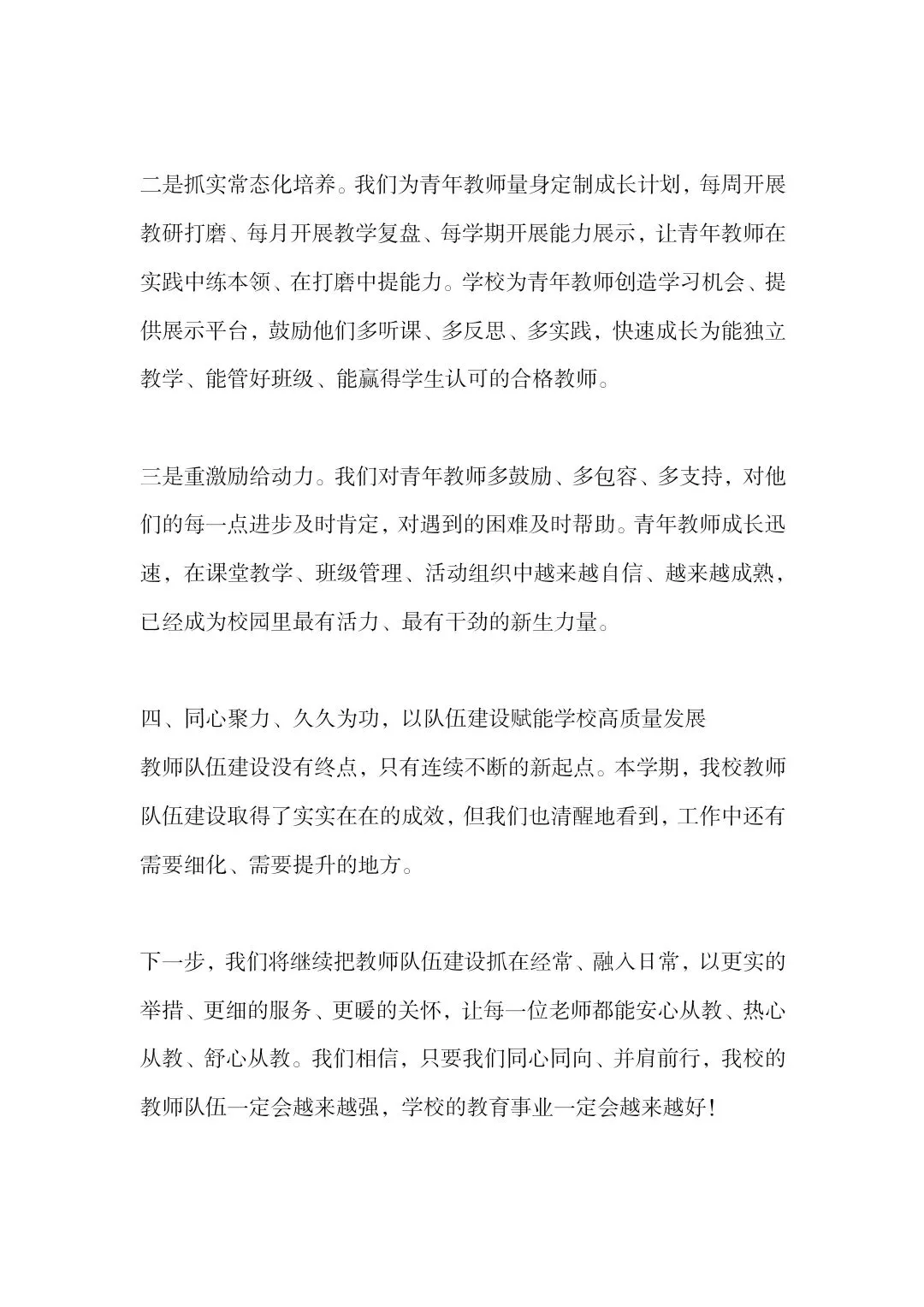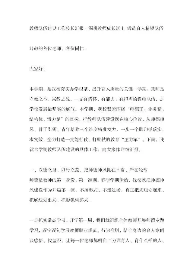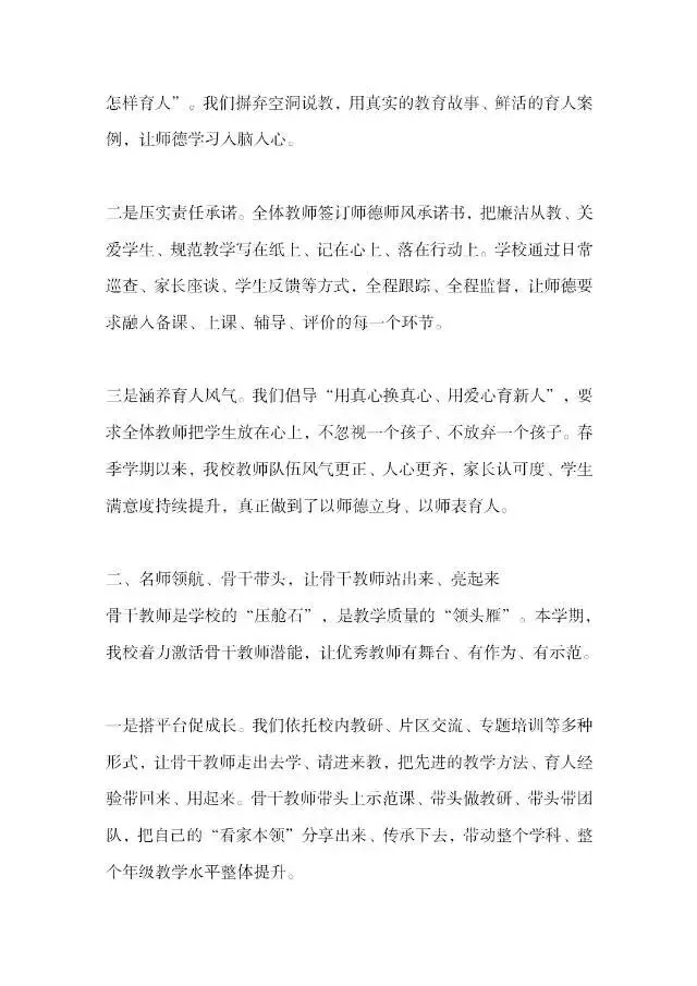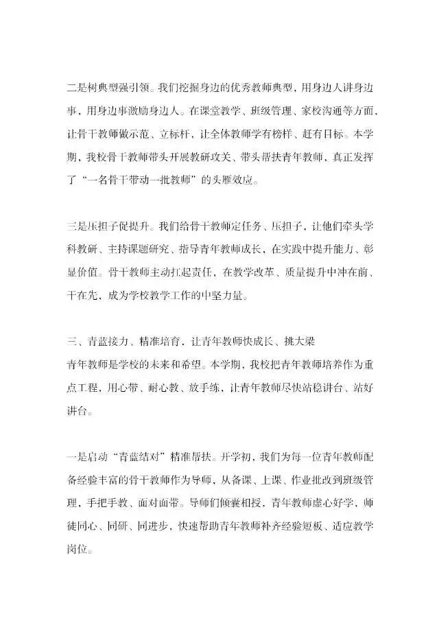 该校本学期围绕“师德正、业务精、结构优、活力足”目标,从三方面推进教师队伍建设:抓实师德师风的常态学习、责任承诺与风气涵养;为骨干教师搭平台、树典型、压担子,发挥其引领作用;通过青蓝结对、常态化培养和激励,助力青年教师快速成长。校方也认识到不足,将持续抓实队伍建设,以其赋能学校高质量发展。