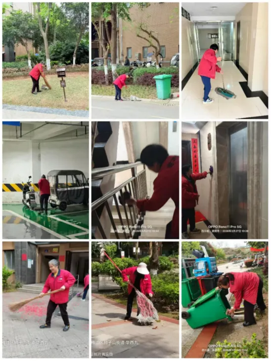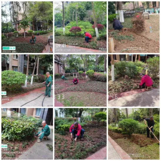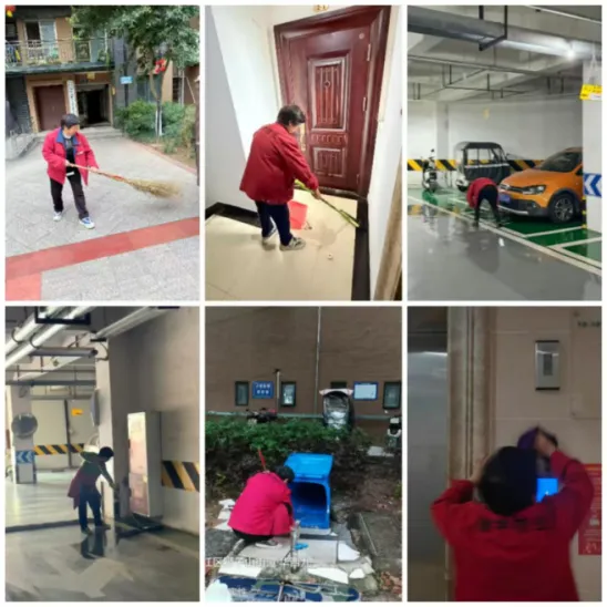 6、保洁人员打扫楼层、车库等公共区域,以及对垃圾桶进行清洗。绿化人员清理落叶、栽种绿植及绿植浇灌。